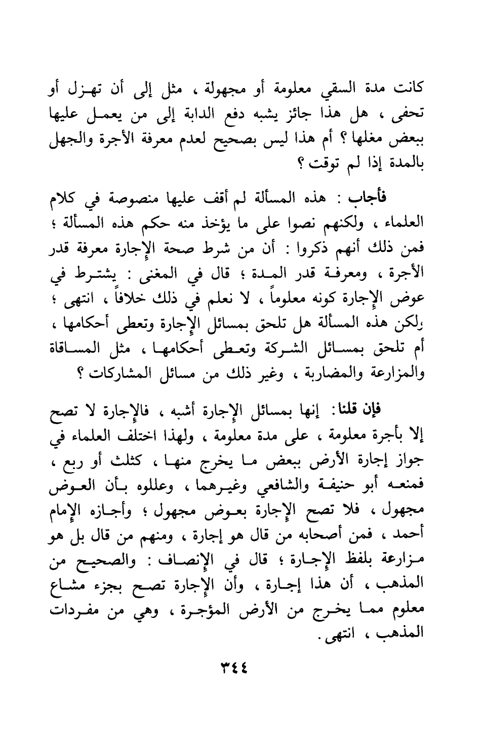 فإن قلنا: إنها بمسائل الإجارة أشبه، فالإجارة لا تصح إلا بأجرة معلومة، على مدة معلومة، ولهذا اختلف العلماء في جواز إجارة الأرض ببعض ما يخرج منها، كثلث أو ربع، فمنعه أبو حنيفة والشافعي وغيرهما، وعللوه بأن العوض مجهول، فلا تصح الإجارة بعوض مجهول; وأجازه الإمام أحمد، فمن أصحابه من قال هو إجارة، ومنهم من قال بل هو مزارعة بلفظ الإجارة; قال في الإنصاف: والصحيح من المذهب، أن هذا إجارة، وأن الإجارة تصح بجزء مشاع معلوم مما يخرج من الأرض الموجودة، وهي من مفردات المذهب، انتهى.