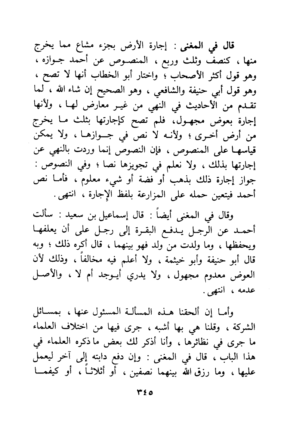 وقال في المغني أيضا: قال إسماعيل بن سعيد: سألت أحمد عن الرجل يدفع البقرة إلى رجل على أن يعلفها ويحفظها وما ولدت من ولد فهو بينهما، قال أكره ذلك، وبه قال أبو حنيفة وأبو خيثمة، ولا أعلم فيه مخالفا، وذلك لأن العوض معدوم مجهول، ولا يدري أيوجد أم لا، والأصل عدمه، انتهى.