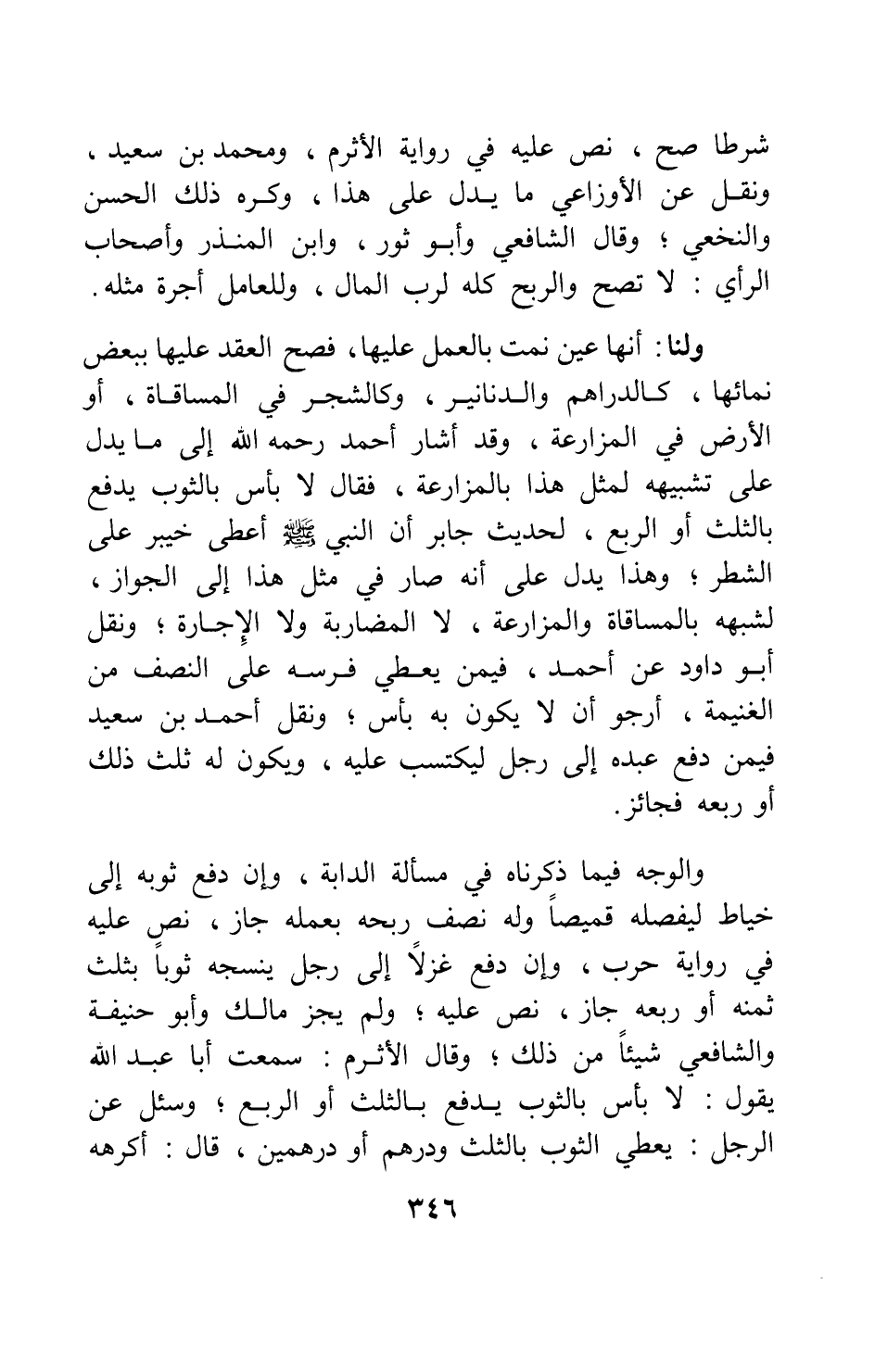 ولنا: أنها عين نمت بالعمل عليها، فصح العقد عليها ببعض نمائها، كالدراهم والدنانير، وكالشجر في المساقاة، أو الأرض في المزارعة، وقد أشار أحمد رحمه الله إلى ما يدل على تشبيهه لمثل هذا بالمزارعة، فقال لا بأس بالثوب يدفع بالثلث أو الربع، لحديث جابر أن النبي صلى الله عليه وسلم أعطى خيبر على الشطر; وهذا يدل على أنه صار في مثل هذا إلى الجواز، لشبهه بالمساقاة والمزارعة، لا المضاربة ولا الإجارة; ونقل أبو داود عن أحمد، فيمن يعطي فرسه على النصف من الغنيمة، أرجو أن لا يكون به بأس، ونقل أحمد بن سعيد فيمن دفع عبده إلى رجل ليكتسب عليه، ويكون له ثلث ذلك أو ربعه فجائز.