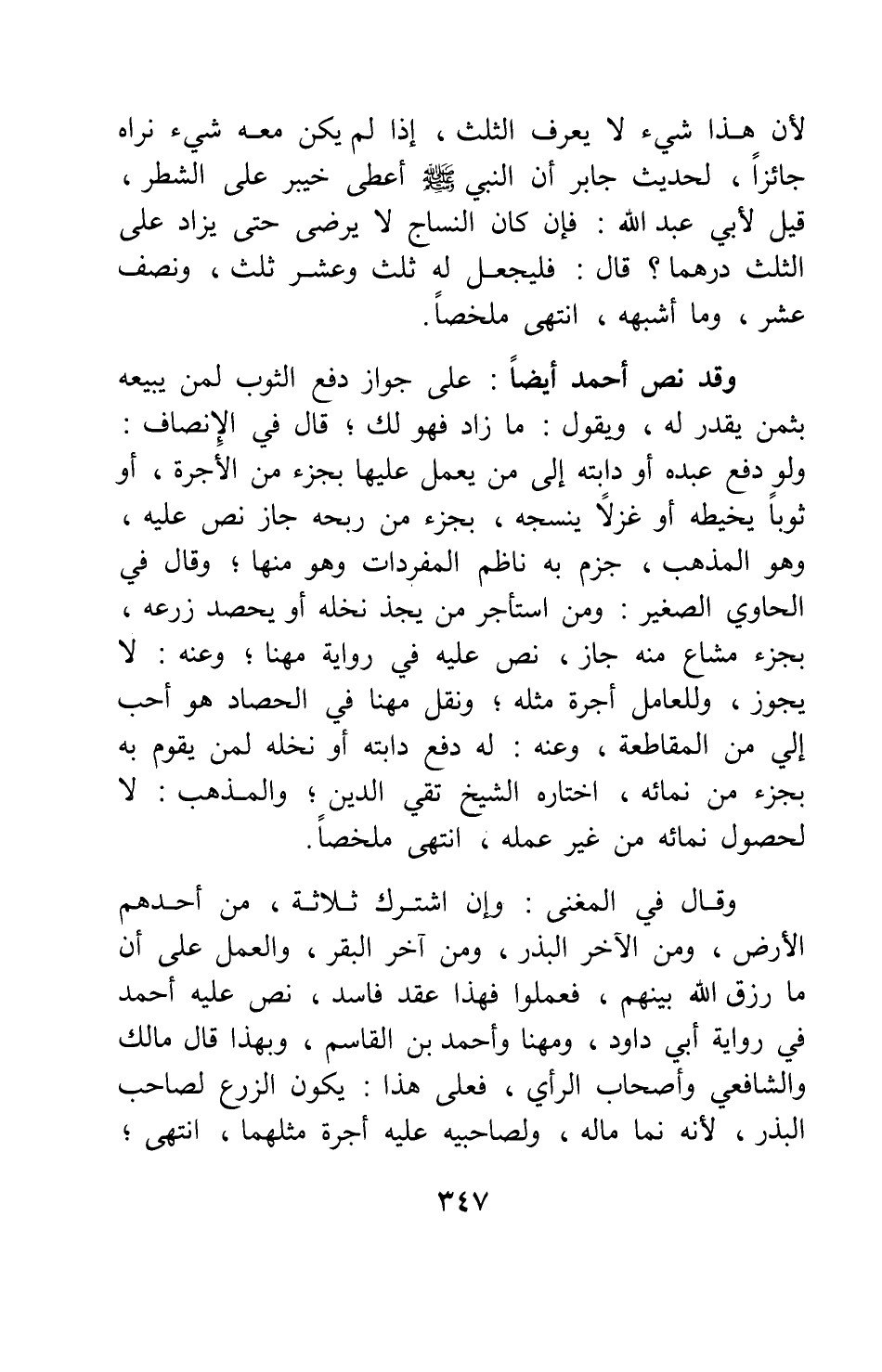 لأن هذا شيء لا يعرف، الثلث إذا لم يكن معه شيء نراه جائزا، لحديث جابر " أن النبي صلى الله عليه وسلم أعطى خيبر على الشطر " 1 قيل لأبي عبد الله: فإن كان النساج لا يرضى حتى يزاد على الثلث درهما؟ قال: فليجعل له ثلث وعشر ثلث، ونصف عشر، وما أشبهه، انتهى ملخصا.