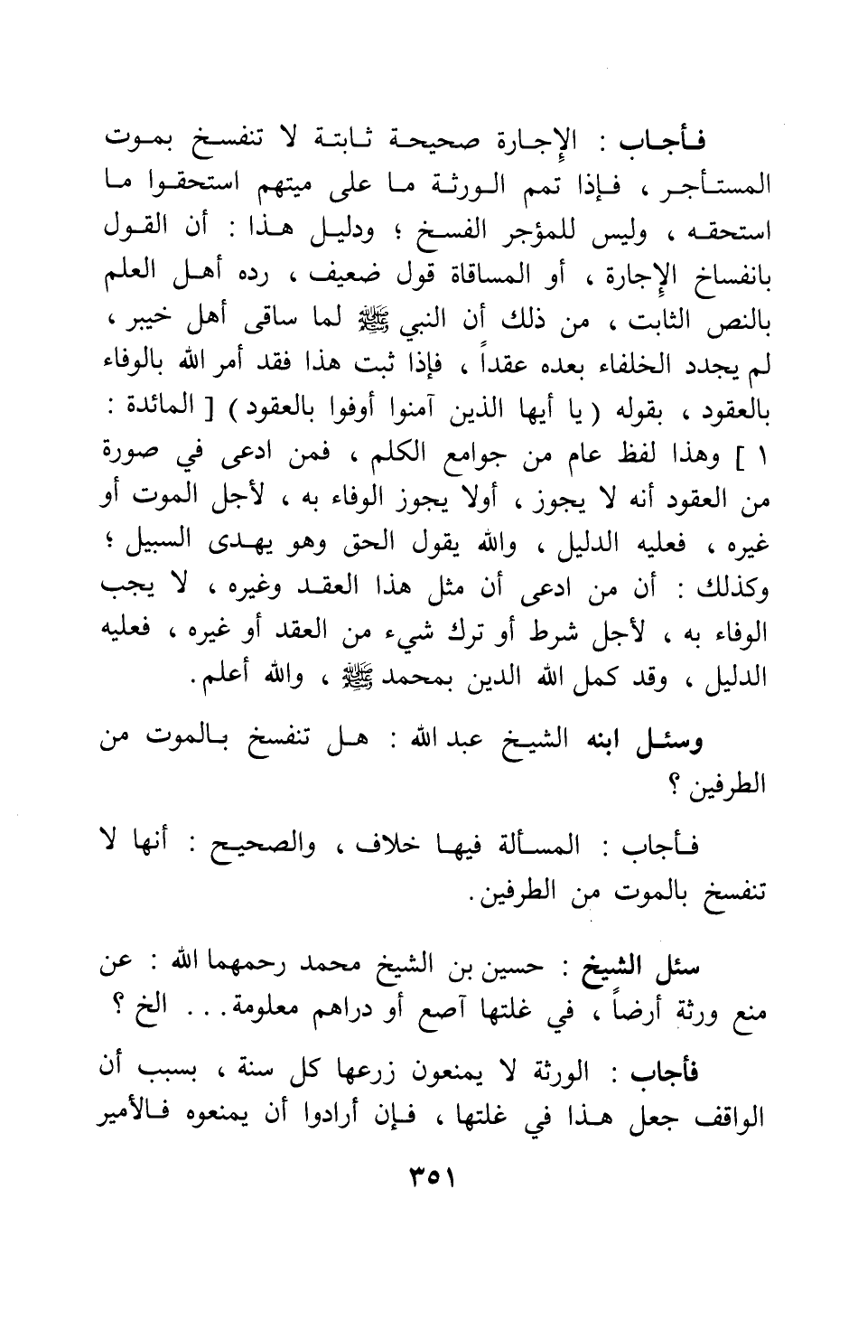 فأجاب: الإجارة صحيحة ثابتة لا تنفسخ بموت المستأجر، فإذا تمم الورثة ما على ميتهم استحقوا ما استحقه، وليس للمؤجر الفسخ; ودليل هذا: أن القول بانفساخ الإجارة، أو المساقاة قول ضعيف، رده أهل العلم بالنص الثابت، من ذلك أن النبي صلى الله عليه وسلم لما ساقى أهل خيبر، لم يجدد الخلفاء بعده عقدا، فإذا ثبت هذا فقد أمر الله بالوفاء بالعقود بقوله {يَا أَيُّهَا الَّذِينَ آمَنُوا أَوْفُوا بِالْعُقُودِ} [سورة المائدة آية: 1] وهذا لفظ عام من جوامع الكلم، فمن ادعى في صورة من العقود أنه لا يجوز، أو لا يجوز الوفاء به لأجل الموت أو غيره، فعليه الدليل، والله يقول الحق وهو يهدي السبيل وكذلك: أن من ادعى أن مثل هذا العقد وغيره، لا يجب الوفاء به، لأجل شرط أو ترك شيء من العقد أو غيره، فعليه الدليل، وقد كمل الله الدين بمحمد صلى الله عليه وسلم والله أعلم.