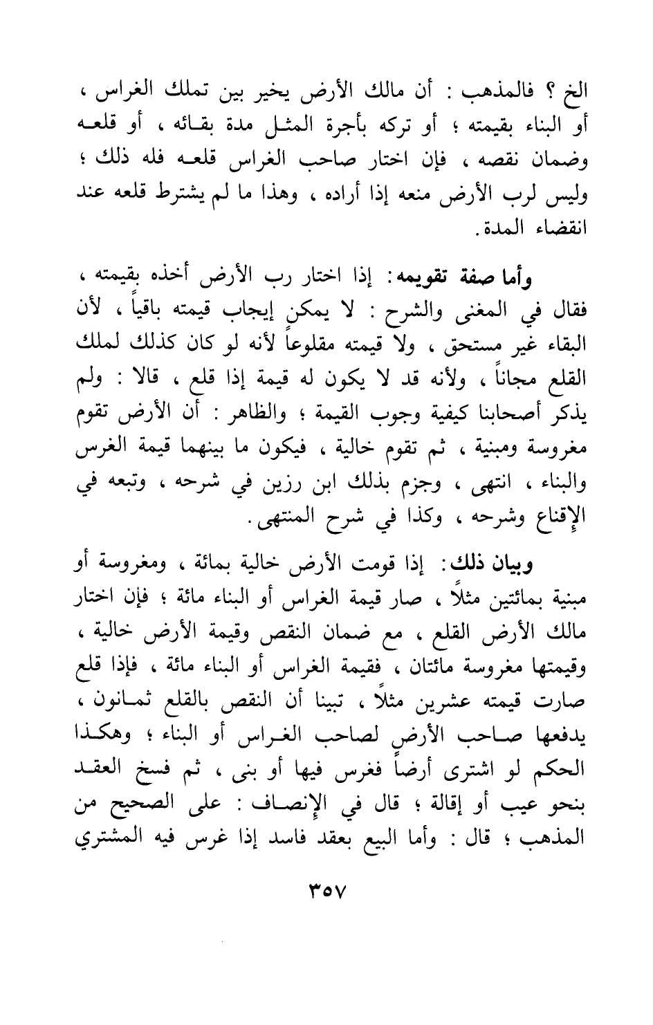 وبيان ذلك: إذا قومت الأرض خالية بمائة، ومغروسة أو مبنية بمائتين مثلا، صار قيمة الغراس أو البناء مائة; فإن اختار مالك الأرض القلع، مع ضمان النقص وقيمة الأرض خالية، وقيمتها مغروسة مائتان، فقيمة الغراس أو البناء مائة، فإذا قلع صارت قيمته عشرين مثلا، تبينا أن النقص بالقلع ثمانون، يدفعها صاحب الأرض لصاحب الغراس أو البناء; وهكذا الحكم لو اشترى أرضا فغرس فيها أو بنى، ثم فسخ العقد بنحو عيب أو إقالة، قال في الإنصاف: على الصحيح من المذهب; قال: وأما البيع بعقد فاسد إذا غرس فيه المشتري