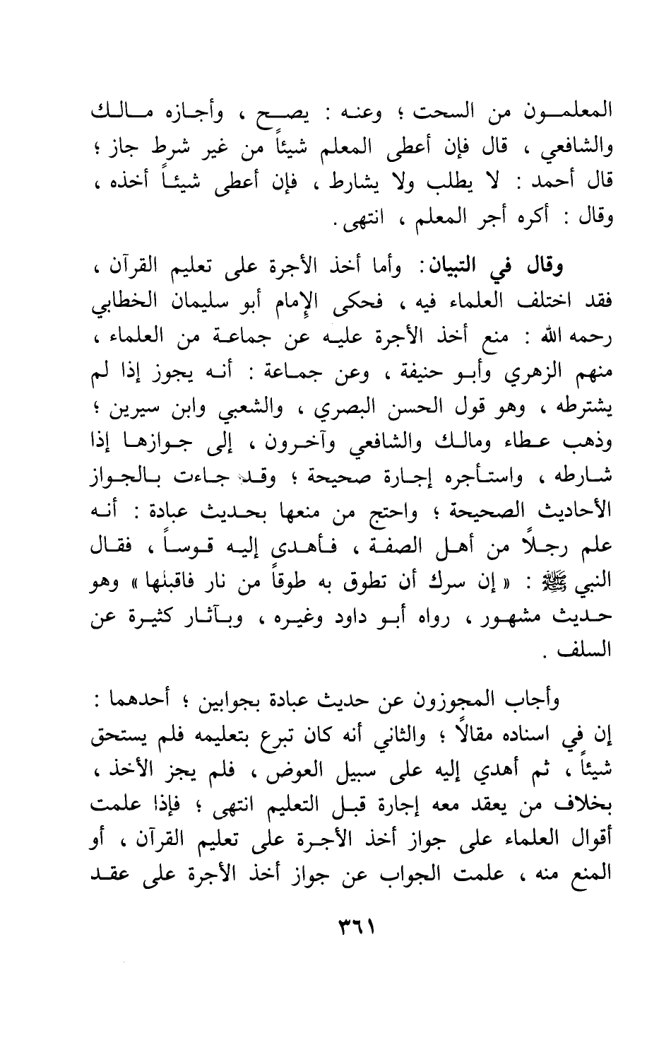 وقال في التبيان: وأما أخذ الأجرة على تعليم القرآن فقد اختلف العلماء فيه، فحكى الإمام أبو سليمان الخطابي رحمه الله: منع أخذ الأجرة عليه عن جماعة من العلماء، منهم الزهري وأبو حنيفة، وعن جماعة: أنه يجوز إذا لم يشترطه، وهو قول الحسن البصري، والشعبي وابن سيرين; وذهب عطاء ومالك والشافعي وآخرون، إلى جوازها إذا شارطه، واستأجره إجارة صحيحة، وقد جاءت بالجواز الأحاديث الصحيحة; واحتج من منعها بحديث عبادة: "أنه علم رجلا من أهل الصفة، فأهدى إليه قوسا، فقال النبي: إن سرك أن تطوق به طوقا من نار فاقبلها " 1 وهو حديث مشهور، رواه أبو داود وغيره، وبآثار كثيرة عن السلف.