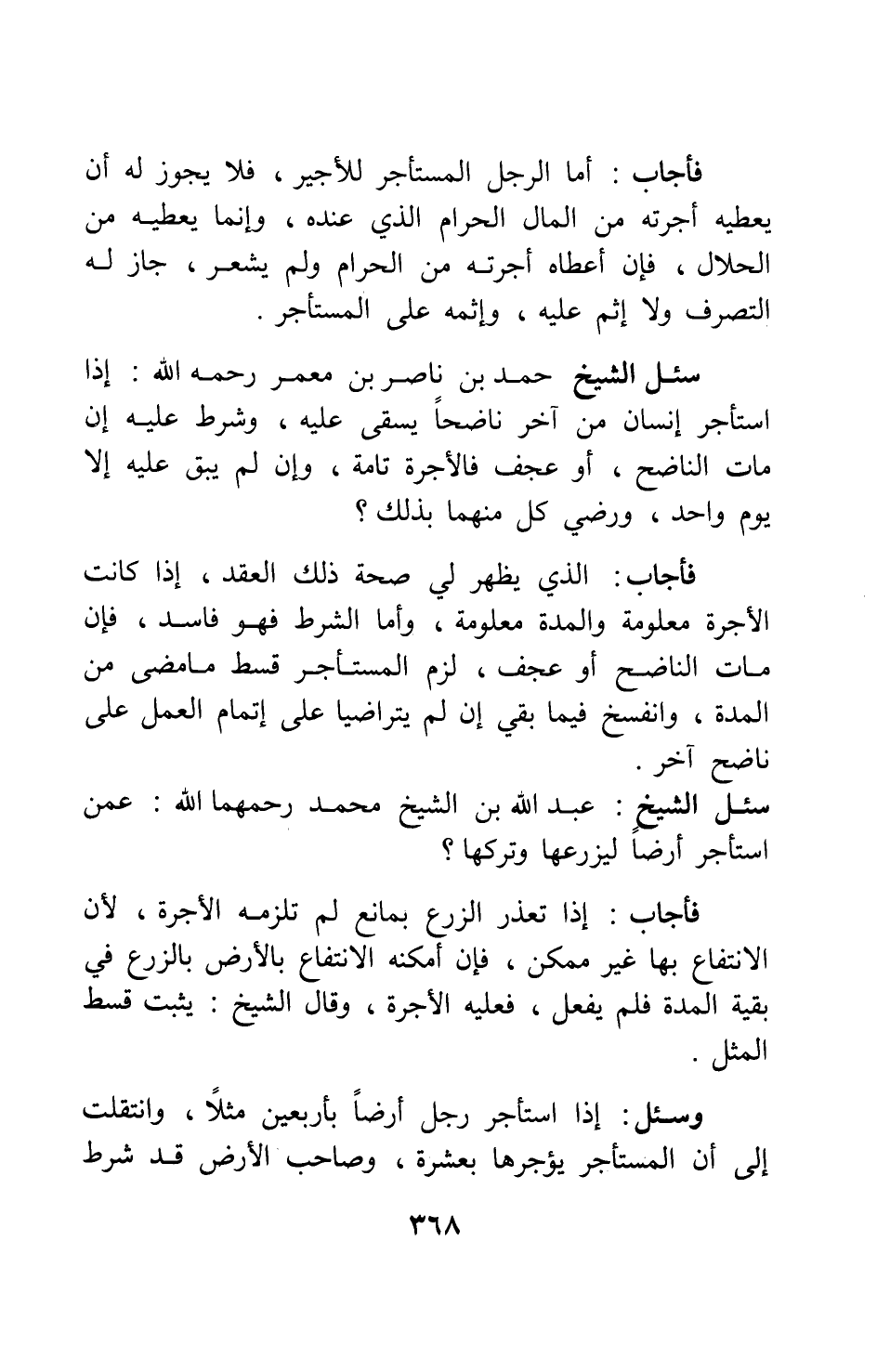 فأجاب: الذي يظهر لي صحة ذلك العقد، إذا كانت الأجرة معلومة والمدة معلومة، وأما الشرط فهو فاسد، فإن مات الناضح أو عجف، لزم المستأجر قسط ما مضى من المدة، وانفسخ فيما بقي إن لم يتراضيا على إتمام العمل على ناضح آخر.