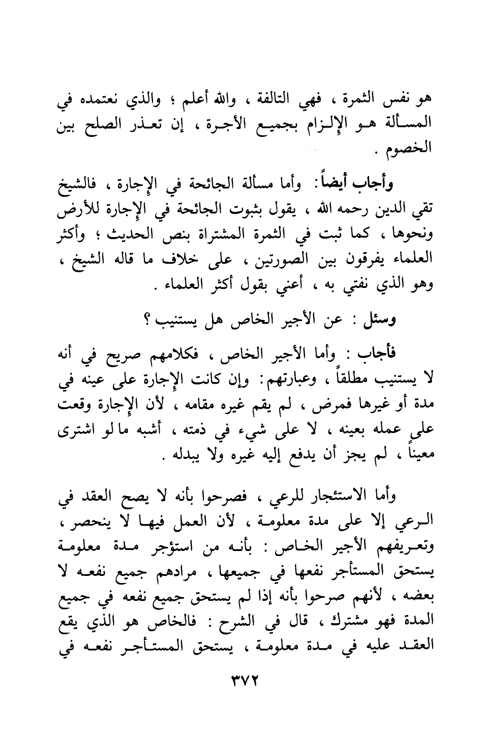 وأجاب أيضا: وأما مسألة الجائحة في الإجارة، فالشيخ تقي الدين رحمه الله، يقول بثبوت الجائحة في الإجارة للأرض ونحوها، كما ثبت في الثمرة المشتراة بنص الحديث; وأكثر العلماء يفرقون بين الصورتين، على خلاف ما قاله الشيخ، وهو الذي نفتي به، أعني بقول أكثر العلماء.