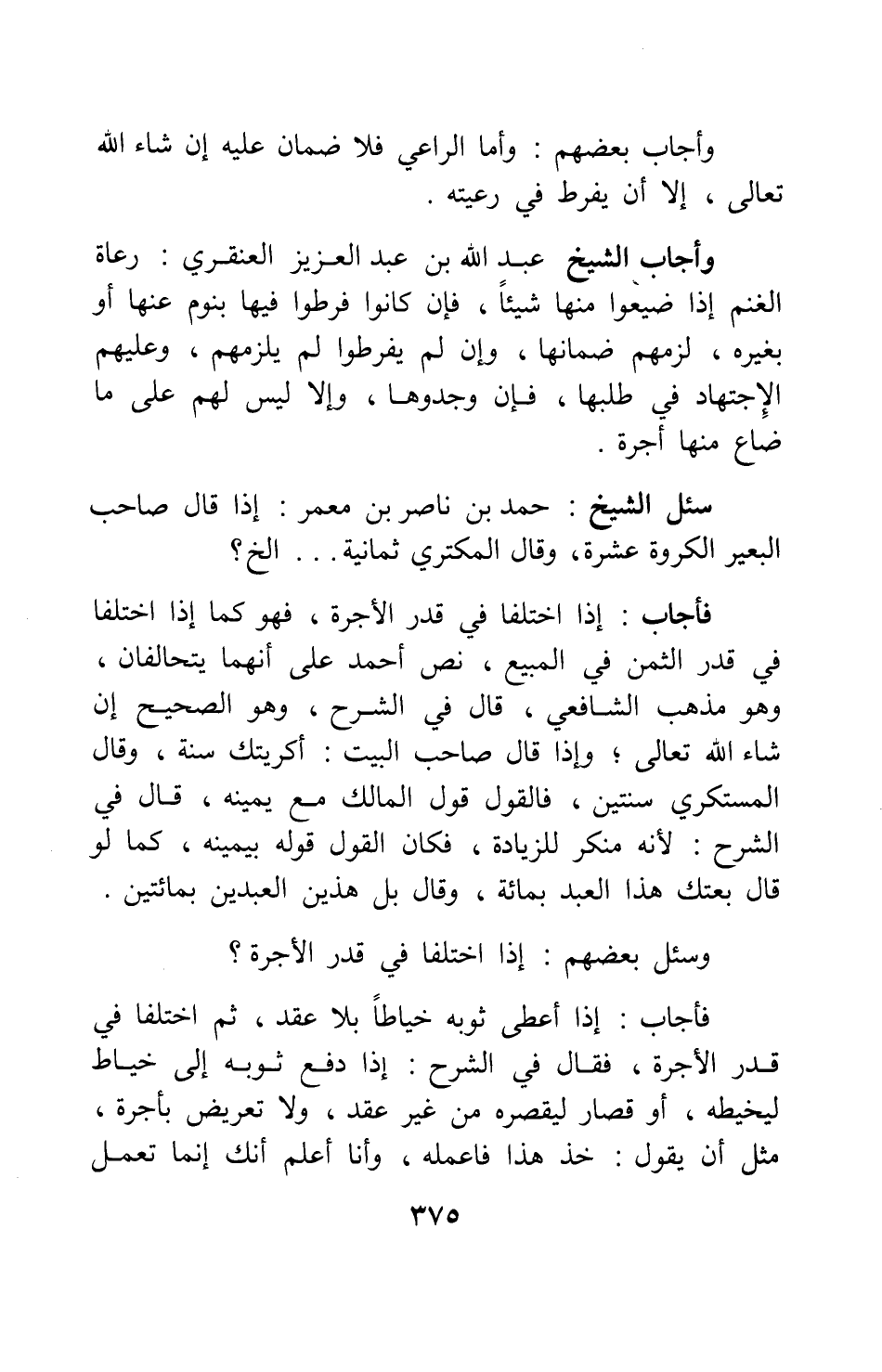 وأجاب الشيخ عبد الله بن عبد العزيز العنقري: رعاة الغنم إذا ضيعوا منها شيئا، فإن كانوا فرطوا فيها بنوم عنها أو بغيره، لزمهم ضمانها، وإن لم يفرطوا لم يلزمهم، وعليهم الاجتهاد في طلبها، فإن وجدوها، وإلا ليس لهم على ما ضاع منها أجرة.