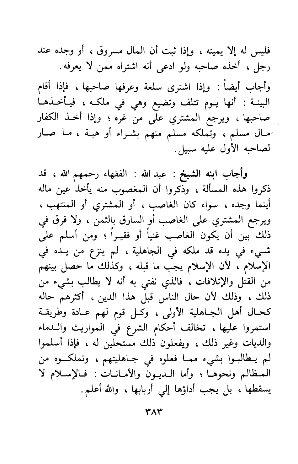 وأجاب ابنه الشيخ: عبد الله: الفقهاء رحمهم الله، قد ذكروا هذه المسألة، وذكروا أن المغصوب منه يأخذ عين ماله أينما وجده، سواء كان الغاصب، أو المشتري أو المنتهب، ويرجع المشتري على الغاصب أو السارق بالثمن، ولا فرق في ذلك بين أن يكون الغاصب غنيا أو فقيرا، ومن أسلم على شيء في يده قد ملكه في الجاهلية، لم ينْزع من يده في الإسلام، لأن الإسلام يجُبُّ ما قبله، وكذلك ما حصل بينهم من القتل والإتلافات، فالذي نفتي به أنه لا يطالب بشيء من ذلك، وذلك لأن حال الناس قبل هذا الدين، أكثرهم حاله كحال أهل الجاهلية الأولى، وكل قوم لهم عادة وطريقة استمروا عليها، تخالف أحكام الشرع في المواريث والدماء والديات وغير ذلك، ويفعلون ذلك مستحلين له، فإذا أسلموا لم يطالبوا بشيء مما فعلوه في جاهليتهم، وتملكوه من المظالم ونحوها، وأما الديون والأمانات: فالإسلام لا يسقطها، بل يجب أداؤها إلى أربابها، والله أعلم.