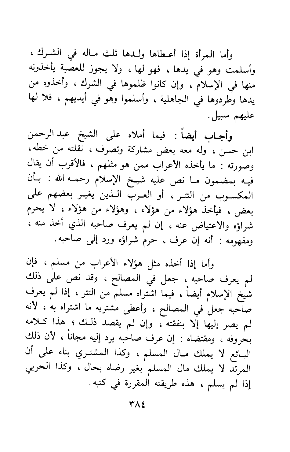 وأجاب أيضا: فيما أملاه على الشيخ عبد الرحمن بن حسن، وله معه بعض مشاركة وتصرف، نقلته من خطه، وصورته: ما يأخذه الأعراب ممن هو مثلهم، فالأقرب أن يقال فيه بمضمون ما نص عليه شيخ الإسلام رحمه الله: بأن المكسوب من التتر، أو العرب الذين يغير بعضهم على بعض، فيأخذ هؤلاء من هؤلاء، وهؤلاء من هؤلاء، لا يحرم شراؤه والاعتياض عنه، إن لم يعرف صاحبه الذي أخذ منه، ومفهومه: أنه إن عرف، حرم شراؤه وردّ إلى صاحبه.