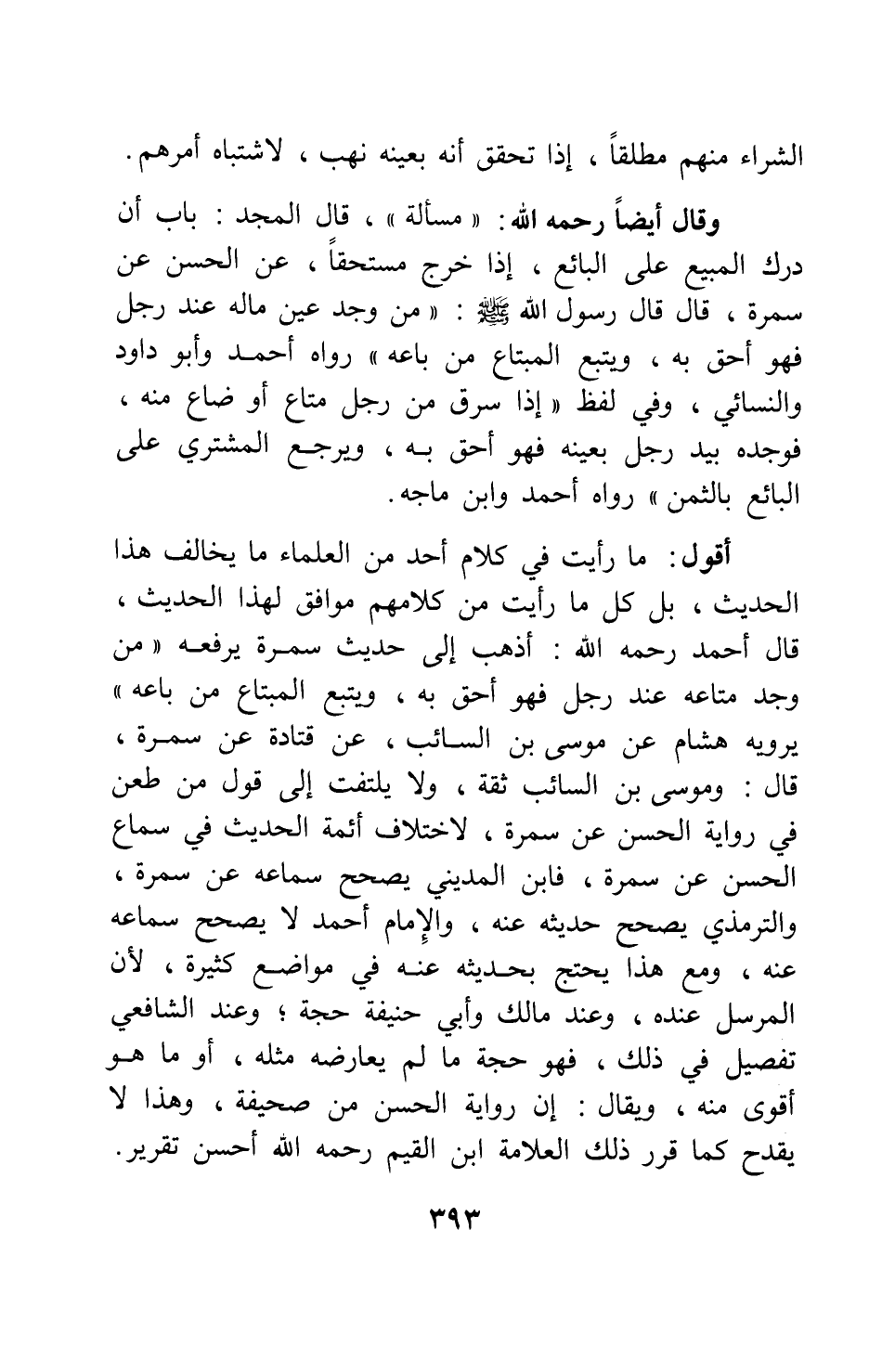 أقول: ما رأيت في كلام أحد من العلماء ما يخالف هذا الحديث، بل كل ما رأيت من كلامهم موافق لهذا الحديث، قال أحمد رحمه الله: أذهب إلى حديث سمرة يرفعه " من وجد متاعه عند رجل فهو أحق به، ويتبع المبتاع من باعه " 3 يرويه هشام عن موسى بن السائب، عن قتادة عن سمرة، قال: وموسى بن السائب ثقة، ولا يلتفت إلى قول من طعن في رواية الحسن عن سمرة، لاختلاف أئمة الحديث في سماع الحسن عن سمرة، فابن المديني يصحح سماعه عن سمرة، والترمذي يصحح حديثه عنه، والإمام أحمد لا يصحح سماعه عنه، ومع هذا يحتج بحديثه عنه في مواضع كثيرة، لأن المرسل عنده، وعند مالك وأبي حنيفة حجة، وعند الشافعي تفصيل في ذلك، فهو حجة ما لم يعارضه مثله، أو ما هو أقوى منه، ويقال: إن رواية الحسن من صحيفة، وهذا لا يقدح كما قرر ذلك العلامة ابن القيم رحمه الله أحسن تقرير.