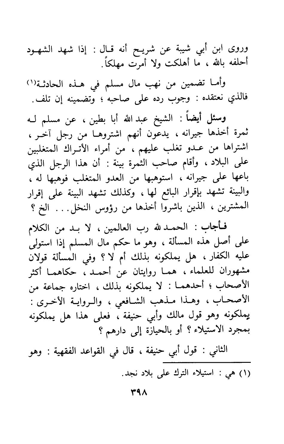 وسئل أيضا: الشيخ عبد الله أبا بطين، عن مسلم له ثمرة أخذها جيرانه، يدعون أنهم اشتروها من رجل آخر اشتراها من عدو تغلب عليهم، من أمراء الأتراك المتغلبين على البلاد، وأقام صاحب الثمرة بينة: أن هذا الرجل الذي باعها على جيرانه، استوهبها من العدو المتغلب فوهبها له، والبينة تشهد بإقرار البائع لها، وكذلك تشهد البينة على إقرار المشترين، الذين باشروا أخذها من رءوس النخل ... إلخ؟