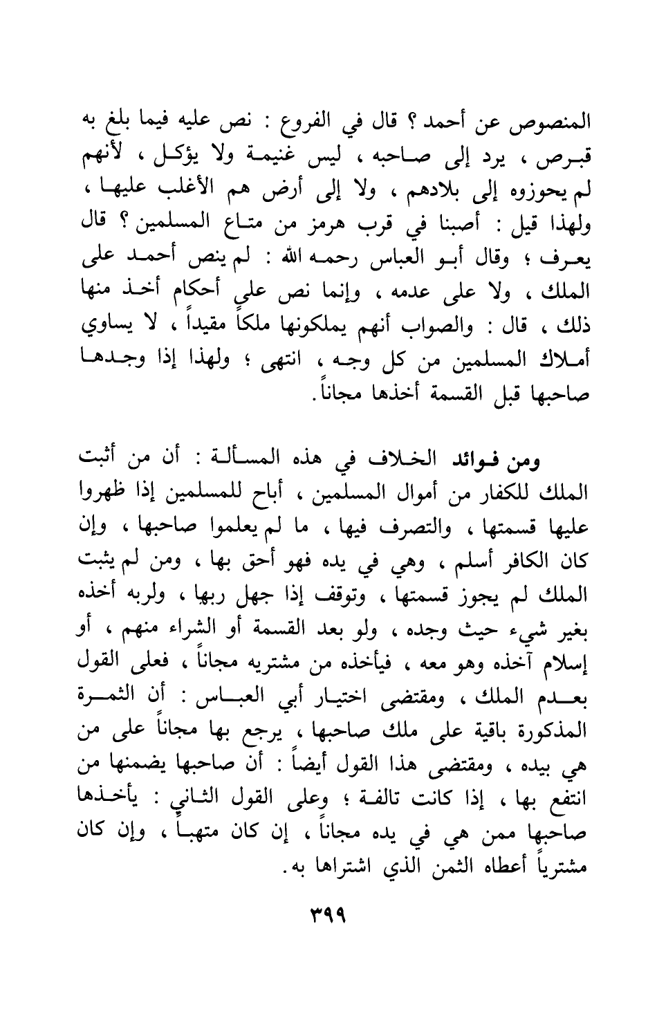 ومن فوائد الخلاف في هذه المسألة: أن من أثبت الملك للكفار من أموال المسلمين، أباح للمسلمين إذا ظهروا عليها قسمتها، والتصرف فيها، ما لم يعلموا صاحبها، وإن كان الكافر أسلم، وهي في يده فهو أحق بها، ومن لم يثبت الملك لم يجوز قسمتها، وتوقف إذا جهل ربها، ولربه أخذه بغير شيء حيث وجده، ولو بعد القسمة أو الشراء منهم، أو إسلام آخذه وهو معه، فيأخذه من مشتريه مجانا، فعلى القول بعدم الملك، ومقتضى اختيار أبي العباس: أن الثمرة المذكورة باقية على ملك صاحبها، يرجع بها مجانا على من هي بيده، ومقتضى هذا القول أيضا: أن صاحبها يضمنها من انتفع بها، إذا كانت تالفة، وعلى القول الثاني: يأخذها صاحبها ممن هي في يده مجانا، إن كان مُتَّهبا، وإن كان مشتريا أعطاه الثمن الذي اشتراها به.