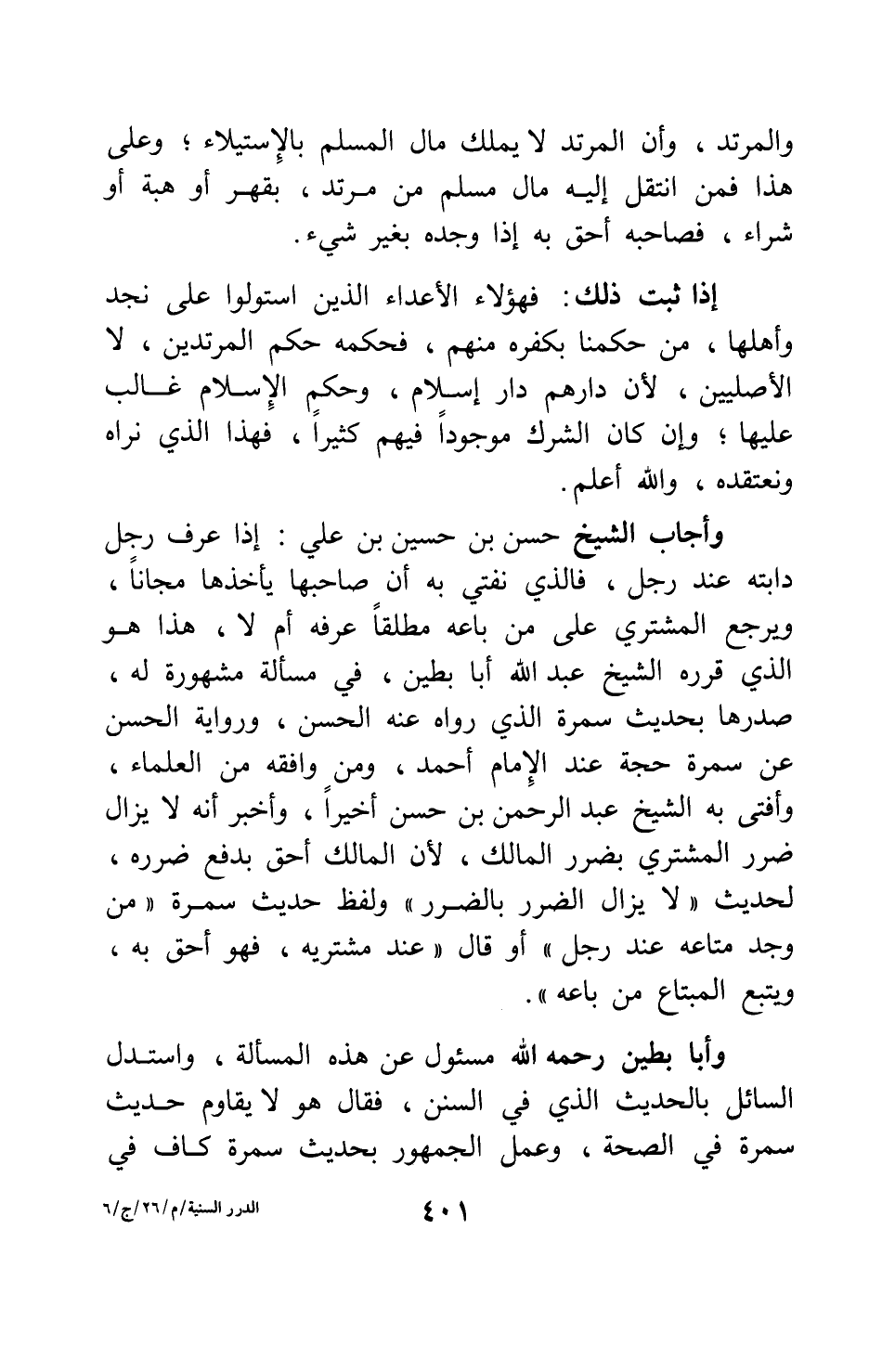 وأجاب الشيخ حسن بن حسين بن علي: إذا عرف رجل دابته عند رجل، فالذي نفتي به أن صاحبها يأخذها مجانا، ويرجع المشتري على من باعه مطلقا عرفه أم لا، هذا هو الذي قرره الشيخ عبد الله أبا بطين، في مسألة مشهورة له، صدرها بحديث سمرة الذي رواه عنه الحسن، ورواية الحسن عن سمرة حجة عند الإمام أحمد، ومن وافقه من العلماء، وأفتى به الشيخ عبد الرحمن بن حسن أخيرا، وأخبر أنه لا يزال ضرر المشتري بضرر المالك، لأن المالك أحق بدفع ضرره، لحديث " لا يزال الضرر بالضرر " ولفظ حديث سمرة " من وجد متاعه عند رجل أو قال عند مشتريه، فهو أحق به، ويتبع المبتاع من باعه " 1 وأبا بطين رحمه الله مسئول عن هذه المسألة، واستدل السائل بالحديث الذي في السنن، فقال هو لا يقاوم حديث سمرة في الصحة، وعمل الجمهور بحديث سمرة كاف في