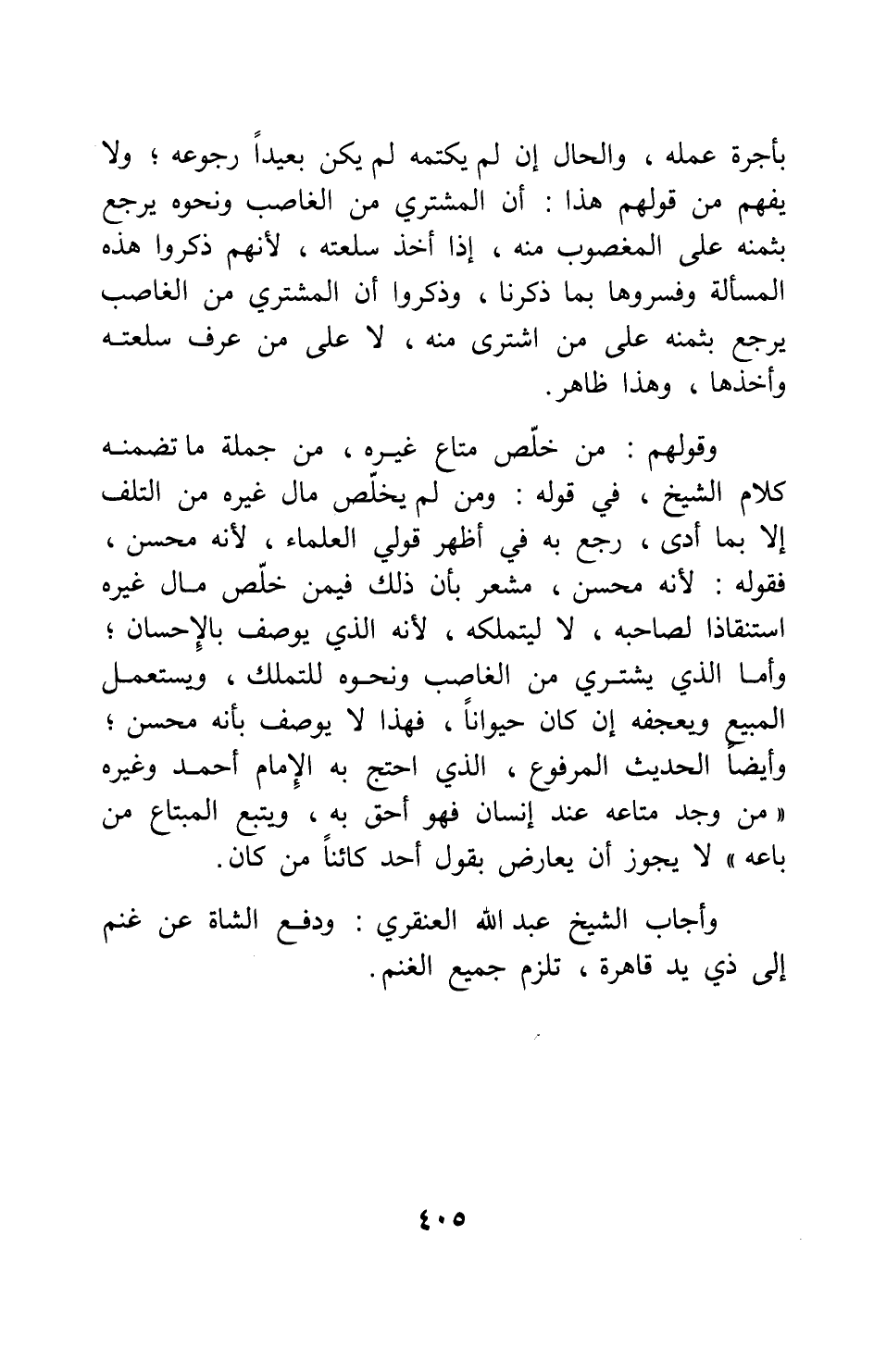 وقولهم: من خلص متاع غيره، من جملة ما تضمنه كلام الشيخ، في قوله: ومن لم يخلص مال غيره من التلف إلا بما أدى، رجع به في أظهر قولي العلماء، لأنه محسن، فقوله: لأنه محسن، مشعر بأن ذلك فيمن خلص مال غيره استنقاذا لصاحبه، لا ليتملكه، لأنه الذي يوصف بالإحسان; وأما الذي يشتري من الغاصب ونحوه للتملك، ويستعمل المبيع ويعجفه إن كان حيوانا، فهذا لا يوصف بأنه محسن; وأيضا الحديث المرفوع، الذي احتج به الإمام أحمد وغيره " من وجد متاعه عند إنسان فهو أحق به ويتبع المبتاع من باعه " 1 لا يجوز أن يعارض بقول أحد كائنا من كان.