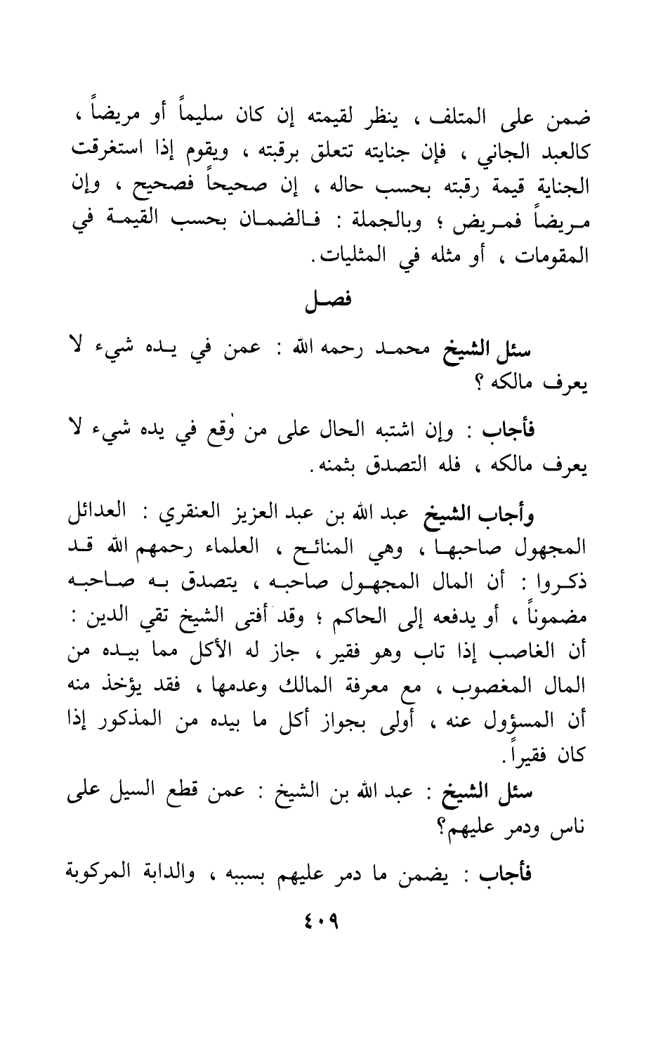 وأجاب الشيخ عبد الله بن عبد العزيز العنقري: العدائل المجهول صاحبها، وهي المنائح، العلماء رحمهم الله قد ذكروا: أن المال المجهول صاحبه، يتصدق به صاحبه مضمونا، أو يدفعه إلى الحاكم; وقد أفتى الشيخ تقي الدين: أن الغاصب إذا تاب وهو فقير، جاز له الأكل مما بيده من المال المغصوب، مع معرفة المالك وعدمها، فقد يؤخذ منه أن المسؤول عنه، أولى بجواز أكل ما بيده من المذكور إذا كان فقيرا.