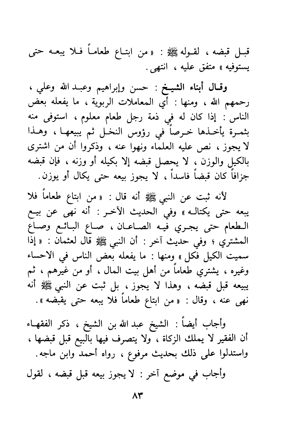 وقال أبناء الشيخ: حسن وإبراهيم وعبد الله وعلي، رحمهم الله، ومنها: أي المعاملات الربوية، ما يفعله بعض الناس: إذا كان له في ذمة رجل طعام معلوم، استوفى منه بثمرة يأخذها خرصا في رؤوس النخل ثم يبيعها، وهذا لا يجوز، نص عليه العلماء ونهوا عنه، وذكروا أن من اشترى بالكيل والوزن، لا يحصل قبضه إلا بكيله أو وزنه، فإن قبضه جزافا كان قبضا فاسدا، لا يجوز بيعه حتى يكال أو يوزن. لأنه ثبت عن النبي صلى الله عليه وسلم أنه قال: " من ابتاع طعاما فلا يبعه حتى يكتاله " 2 وفي الحديث الآخر: أنه " نهى عن بيع الطعام حتى يجري فيه الصاعان، صاع البائع وصاع المشتري " 3 وفي حديث آخر: أن النبي صلى الله عليه وسلم قال لعثمان: " إذا سميت الكيل فكل " ومنها: ما يفعله بعض الناس في الأحساء وغيره، يشتري طعاما من أهل بيت المال، أو من غيرهم، ثم يبيعه قبل قبضه، وهذا لا يجوز، بل ثبت عن النبي صلى الله عليه وسلم أنه نهى عنه، وقال: " من ابتاع طعاما فلا يبعه حتى يقبضه " 4