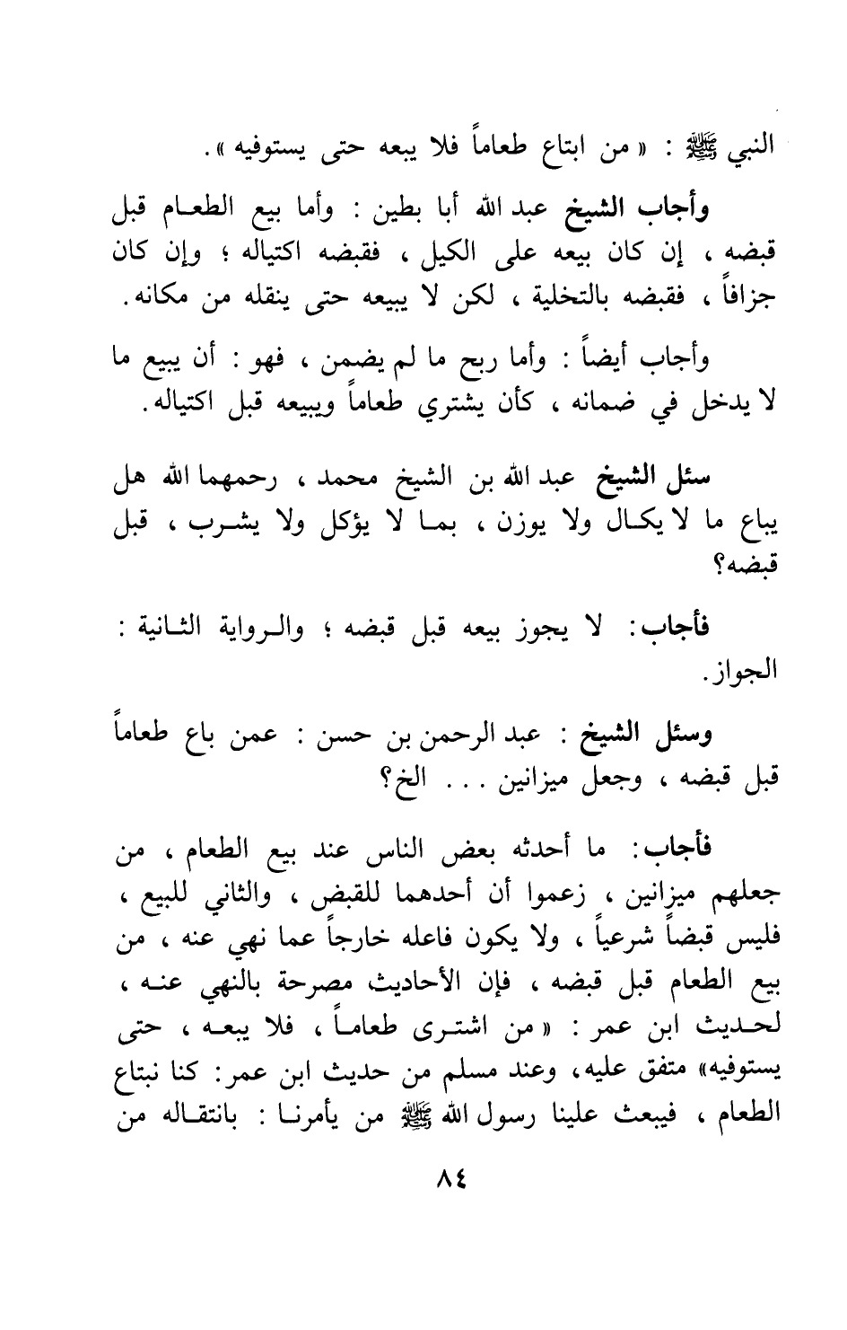فأجاب: ما أحدثه بعض الناس عند بيع الطعام، من جعلهم ميزانين، زعموا أن أحدهما للقبض، والثاني للبيع، فليس قبضا شرعيا، ولا يكون فاعله خارجا عما نهي عنه، من بيع الطعام قبل قبضه، فإن الأحاديث مصرحة بالنهي عنه، لحديث ابن عمر: " من اشترى طعاما، فلا يبعه، حتى يستوفيه " 2 متفق عليه وعند مسلم من حديث " ابن عمر: كنا نبتاع الطعام، فيبعث علينا رسول الله صلى الله عليه وسلم من يأمرنا: بانتقاله من