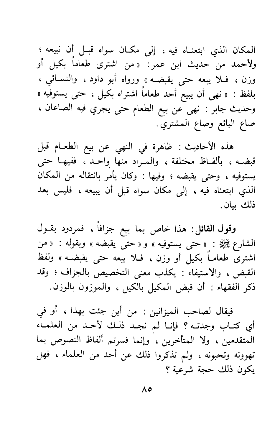 وقول القائل: هذا خاص بما بيع جزافا، فمردود بقول الشارع صلى الله عليه وسلم " حتى يستوفيه " و " حتى يقبضه " وبقوله: " من اشترى طعاما بكيل أو وزن، فلا يبعه حتى يقبضه " 5 ولفظ القبض، والاستيفاء: يكذب معنى التخصيص بالجزاف; وقد ذكر الفقهاء: أن قبض المكيل بالكيل، والموزون بالوزن.