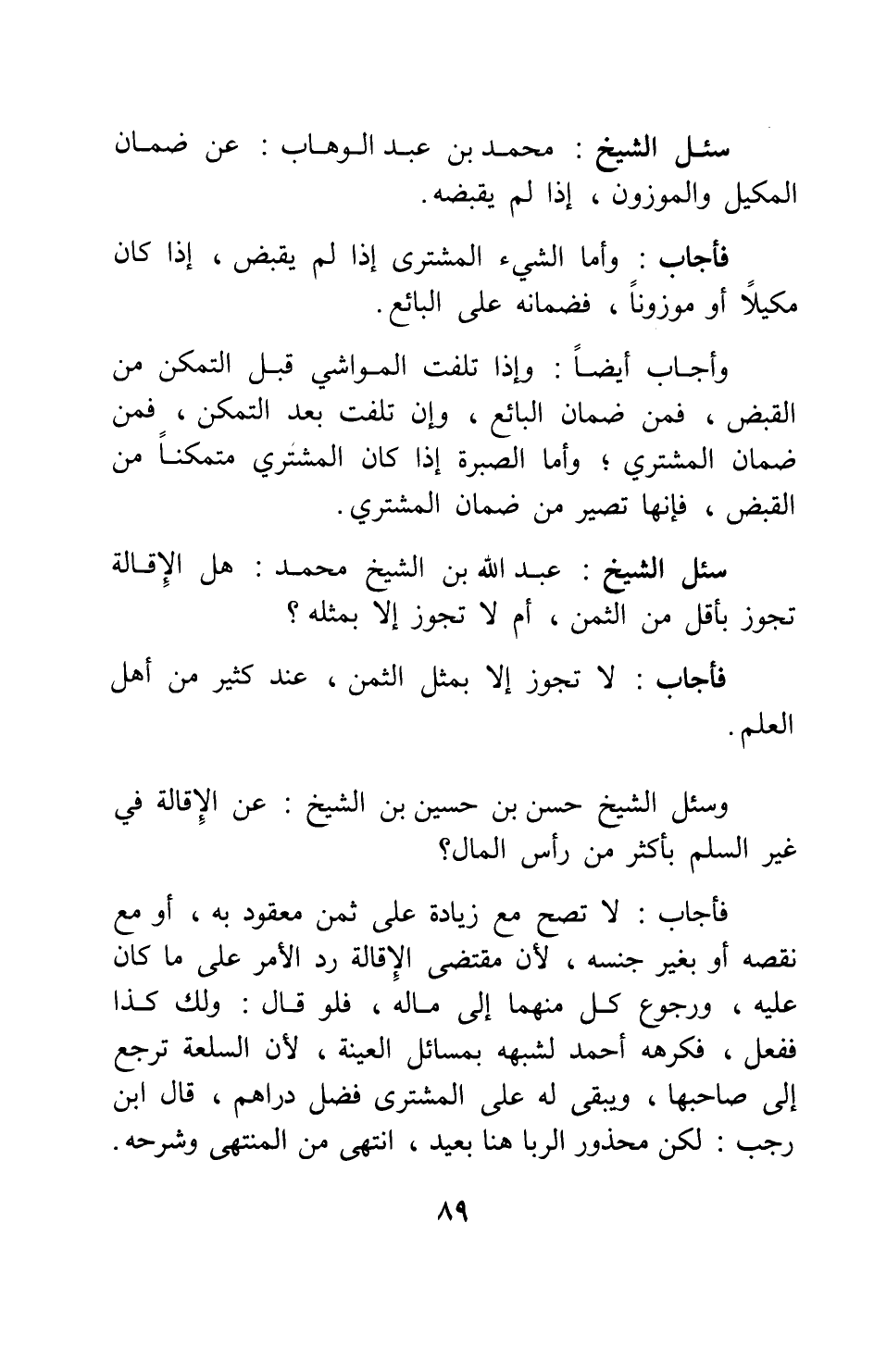 سئل الشيخ: عبد الله بن الشيخ محمد: هل الإقالة تجوز بأقل من الثمن، أم لا تجوز إلا بمثله؟