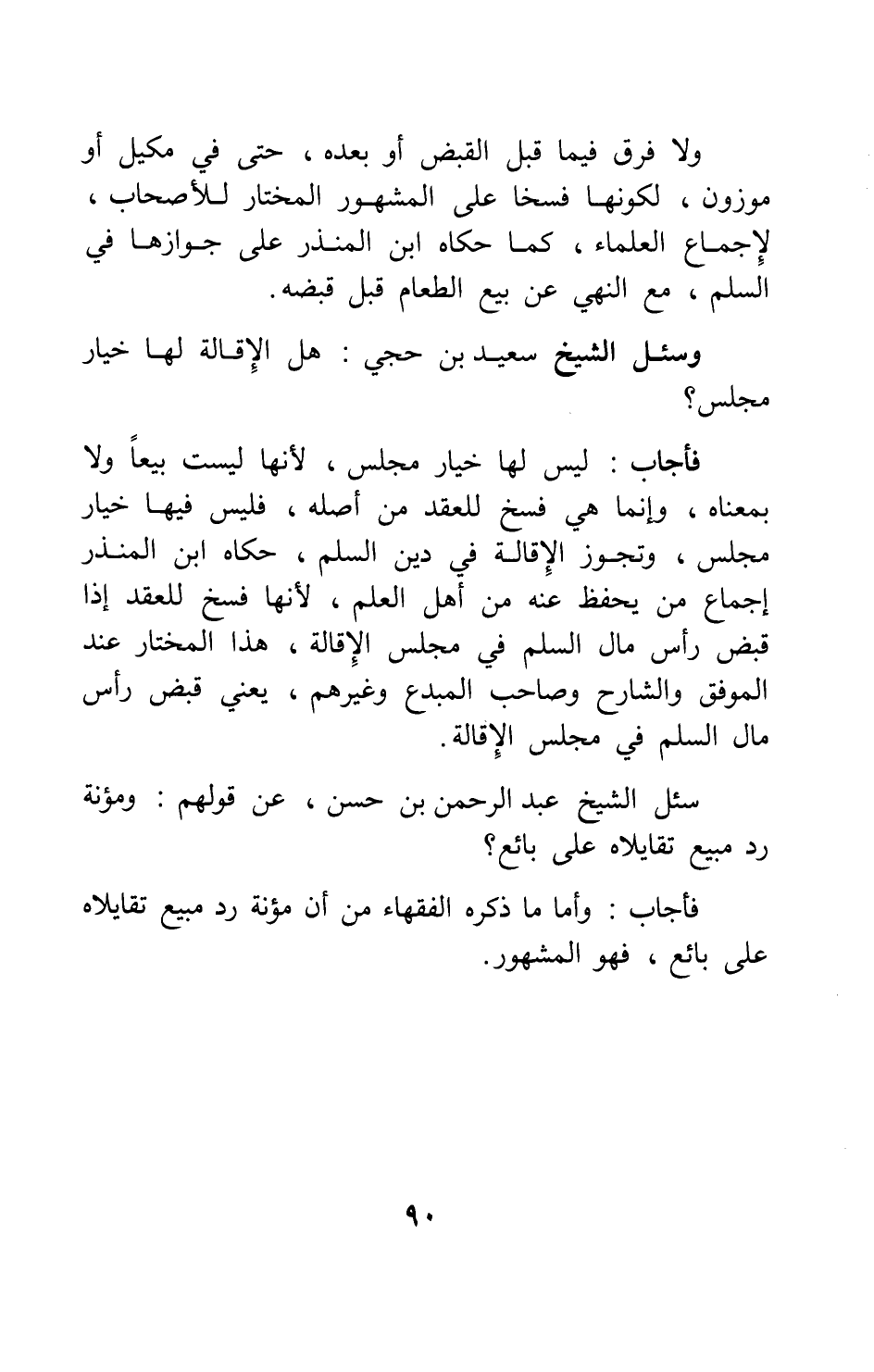 فأجاب: ليس لها خيار مجلس، لأنها ليست بيعا ولا بمعناه، وإنما هي فسخ للعقد من أصله، فليس فيها خيار مجلس، وتجوز الإقالة في دين السلم، حكاه ابن المنذر إجماع من يحفظ عنه من أهل العلم، لأنها فسخ للعقد إذا قبض رأس مال السلم في مجلس الإقالة، هذا المختار عند الموفق والشارح وصاحب المبدع وغيرهم، يعني قبض رأس مال السلم في مجلس الإقالة.
