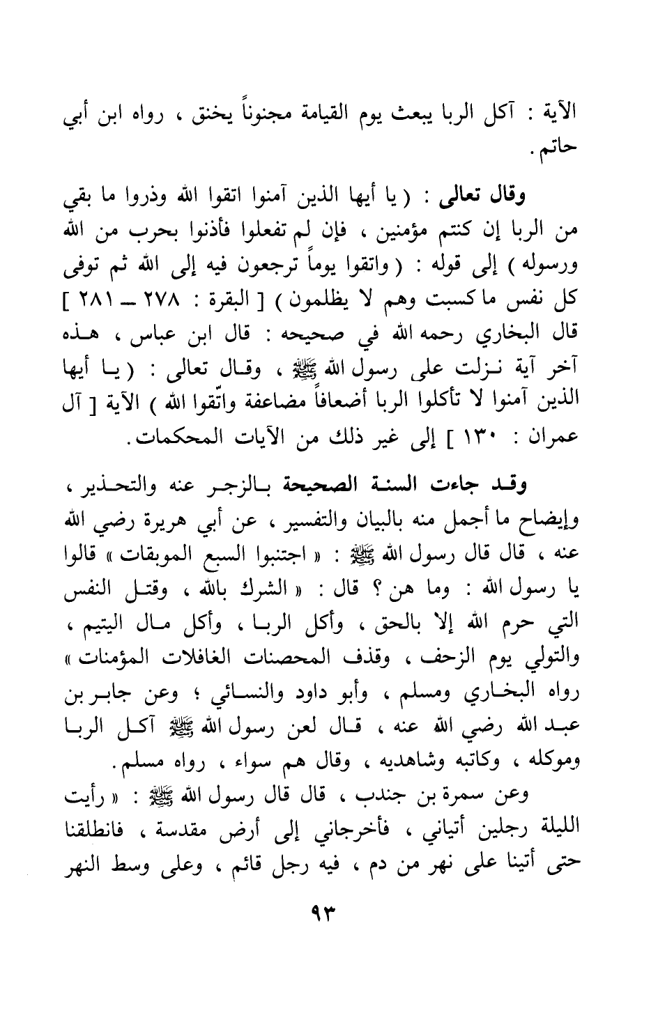 الآية: " آكل الربا يبعث يوم القيامة مجنونا يخنق " رواه ابن أبي حاتم.