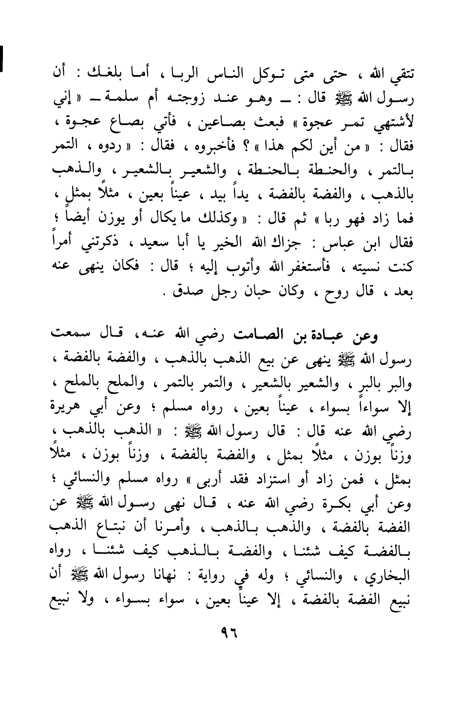 وعن عبادة بن الصامت رضي الله عنه قال: " سمعت رسول الله صلى الله عليه وسلم ينهى عن بيع الذهب بالذهب، والفضة بالفضة، والبر بالبر، والشعير بالشعير، والتمر بالتمر، والملح بالملح، إلا سواءا بسواء، عينا بعين " 1 رواه مسلم.