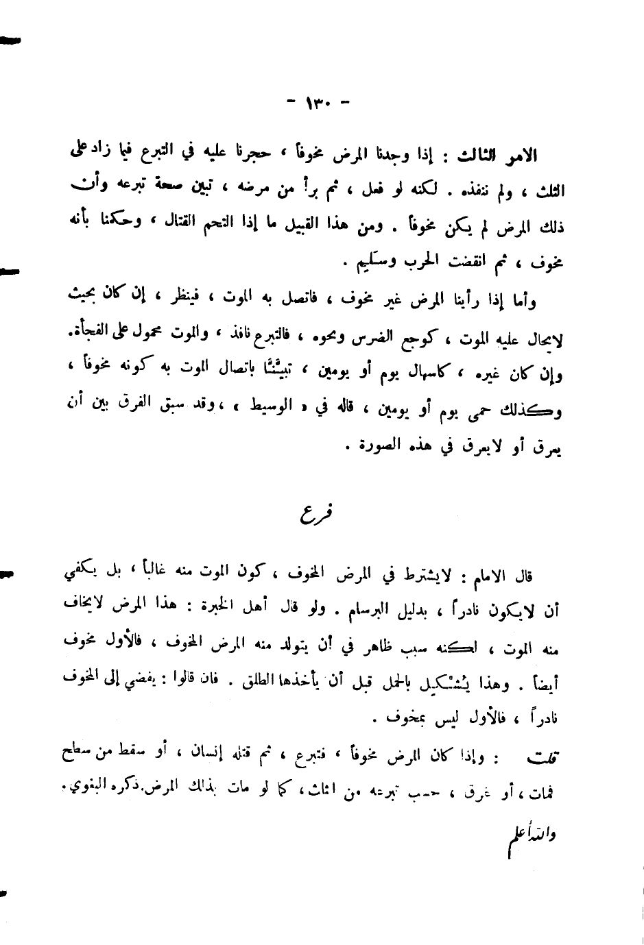 قَالَ الْإِمَامُ: لَا يُشْتَرَطُ فِي الْمَرَضِ الْمَخُوفِ كَوْنُ الْمَوْتِ مِنْهُ غَالِبًا، بَلْ يَكْفِي أَنْ لَا يَكُونَ نَادِرًا بِدَلِيلِ الْبِرْسَامِ. وَلَوْ قَالَ أَهْلُ الْخِبْرَةِ: هَذَا الْمَرَضُ لَا يُخَافُ مِنْهُ الْمَوْتُ، لَكِنَّهُ سَبَبٌ ظَاهِرٌ فِي أَنْ يَتَوَلَّدَ مِنْهُ الْمَرَضُ الْمَخُوفُ، فَالْأَوَّلُ مَخُوفٌ أَيْضًا. وَهَذَا يُشْكِلُ بِالْحَمْلِ قَبْلَ أَنْ يَأْخُذَهَا الطَّلْقُ. فَإِنْ قَالُوا: يُفْضِي إِلَى الْمَخُوفِ نَادِرًا، فَالْأَوَّلُ لَيْسَ بِمَخُوفٍ.