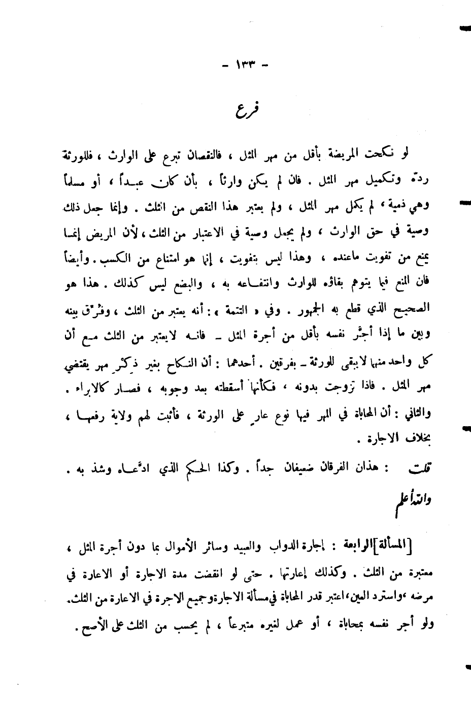 لَوْ نُكِحَتِ الْمَرِيضَةُ بِأَقَلَّ مِنْ مَهْرِ الْمِثْلِ، فَالنُّقْصَانُ تَبَرُّعٌ عَلَى الْوَارِثِ، فَلِلْوَرَثَةِ رَدُّهُ وَتَكْمِيلُ مَهْرِ الْمِثْلِ. فَإِنْ لَمْ يَكُنْ وَارِثًا، بِأَنْ كَانَ عَبْدًا، أَوْ مُسْلِمًا وَهِيَ ذِمِّيَّةٌ، لَمْ يُكْمَلْ مَهْرُ الْمِثْلِ، وَلَمْ يُعْتَبَرْ هَذَا النَّقْصُ مِنَ الثُّلُثِ. وَإِنَّمَا جُعِلَ ذَلِكَ وَصِيَّةً فِي حَقِّ الْوَارِثِ، وَلَمْ يُجْعَلْ وَصِيَّةً فِي الِاعْتِبَارِ مِنَ الثُّلُثِ؛ لِأَنَّ الْمَرِيضَ إِنَّمَا يَمْنَعُ مِنْ تَفْوِيتِ مَا عِنْدَهُ، وَهَذَا لَيْسَ بِتَفْوِيتٍ، إِنَّمَا هُوَ امْتِنَاعٌ مِنَ الْكَسْبِ. وَأَيْضًا فَإِنَّ الْمَنْعَ فِيمَا يُتَوَهَّمُ بَقَاؤُهُ لِلْوَارِثِ وَانْتِفَاعُهُ بِهِ، وَالْبُضْعُ لَيْسَ كَذَلِكَ. هَذَا هُوَ الصَّحِيحُ الَّذِي قَطَعَ بِهِ الْجُمْهُورُ. وَفِي «التَّتِمَّةِ» : أَنَّهُ يُعْتَبَرُ مِنَ الثُّلُثِ، وَفَرْقٌ بَيْنَهُ وَبَيْنَ مَا إِذَا أَجَّرَ نَفْسَهُ بِأَقَلَّ مِنْ أُجْرَةِ الْمِثْلِ - فَإِنَّهُ لَا يُعْتَبَرُ مِنَ الثُّلُثِ مَعَ أَنَّ كُلَّ وَاحِدٍ مِنْهُمَا لَا يَبْقَى لِلْوَرَثَةِ - بِفَرْقَيْنِ. أَحَدُهُمَا: أَنَّ النِّكَاحَ بِغَيْرِ ذِكْرِ مَهْرٍ يَقْتَضِي مَهْرَ الْمِثْلِ، فَإِذَا تَزَوَّجَتْ بِدُونِهِ، فَكَأَنَّهَا أَسْقَطَتْهُ بَعْدَ وُجُوبِهِ، فَصَارَ كَالْإِبْرَاءِ. وَالثَّانِي: أَنَّ الْمُحَابَاةَ فِي الْمَهْرِ فِيهَا نَوْعُ عَارٍ عَلَى الْوَرَثَةِ، فَأُثْبِتَ لَهُمْ وِلَايَةُ رَفْعِهَا، بِخِلَافِ الْإِجَارَةِ.