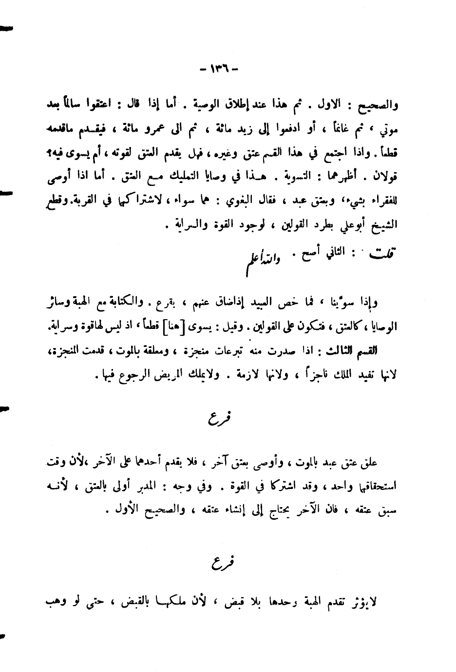 وَالصَّحِيحُ: الْأَوَّلُ. ثُمَّ هَذَا عِنْدَ إِطْلَاقِ الْوَصِيَّةِ. أَمَّا إِذَا قَالَ: أَعْتِقُوا سَالِمًا بَعْدَ مَوْتِي، ثُمَّ غَانِمًا، أَوِ ادْفَعُوا إِلَى زَيْدٍ مِائَةً، ثُمَّ إِلَى عَمْرٍو مِائَةً، فَيُقَدَّمُ مَا قَدَّمَهُ قَطْعًا. وَإِذَا اجْتَمَعَ فِي هَذَا الْقِسْمِ عِتْقٌ وَغَيْرُهُ، فَهَلْ يُقَدَّمُ الْعِتْقُ لِقُوَّتِهِ، أَمْ يُسَوَّى فِيهِ؟ قَوْلَانِ. أَظْهَرُهُمَا: التَّسْوِيَةُ. هَذَا فِي وَصَايَا التَّمْلِيكِ مَعَ الْعِتْقِ. أَمَّا إِذَا أَوْصَى لِلْفُقَرَاءِ بِشَيْءٍ، وَبِعِتْقِ عَبْدٍ، فَقَالَ الْبَغَوِيُّ: هُمَا سَوَاءٌ، لِاشْتِرَاكِهِمَا فِي الْقُرْبَةِ. وَقَطَعَ الشَّيْخُ أَبُو عَلِيٍّ بِطَرْدِ الْقَوْلَيْنِ، لِوُجُودِ الْقُوَّةِ وَالسِّرَايَةِ.