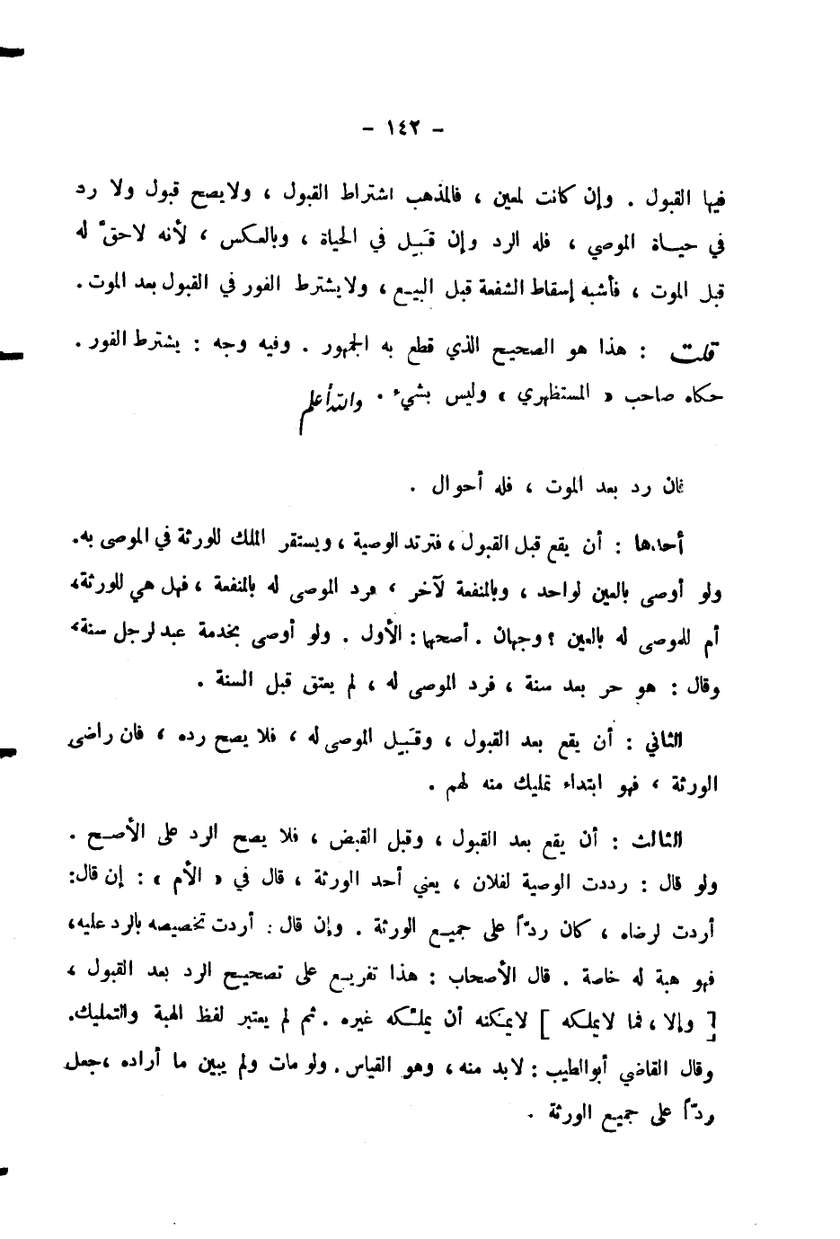 الثَّالِثُ: أَنْ يَقَعَ بَعْدَ الْقَبُولِ، وَقَبْلَ الْقَبْضِ، فَلَا يَصِحُّ الرَّدُّ عَلَى الْأَصَحِّ. وَلَوْ قَالَ: رَدَدْتُ الْوَصِيَّةَ لِفُلَانٍ، يَعْنِي أَحَدَ الْوَرَثَةِ، قَالَ فِي «الْأُمِّ» : إِنْ قَالَ: أَرَدْتُ لِرِضَاهُ، كَانَ رَدًّا عَلَى جَمِيعِ الْوَرَثَةِ. وَإِنْ قَالَ أَرَدْتُ تَخْصِيصَهُ بِالرَّدِّ عَلَيْهِ، فَهُوَ هِبَةٌ لَهُ خَاصَّةً. قَالَ الْأَصْحَابُ: هَذَا تَفْرِيعٌ عَلَى تَصْحِيحِ الرَّدِّ بَعْدَ الْقَبُولِ، [وَإِلَّا فَمَا لَا يَمْلِكُهُ] لَا يُمْكِنُهُ أَنْ يُمَلِّكَهُ غَيْرَهُ. ثُمَّ لَمْ يُعْتَبَرْ لَفْظُ الْهِبَةِ وَالتَّمْلِيكِ. وَقَالَ الْقَاضِي أَبُو الطَّيِّبِ: لَا بُدَّ مِنْهُ، وَهُوَ الْقِيَاسُ. وَلَوْ مَاتَ وَلَمْ يُبَيِّنْ مَا أَرَادَهُ، جُعِلَ رَدًّا عَلَى جَمِيعِ الْوَرَثَةِ.