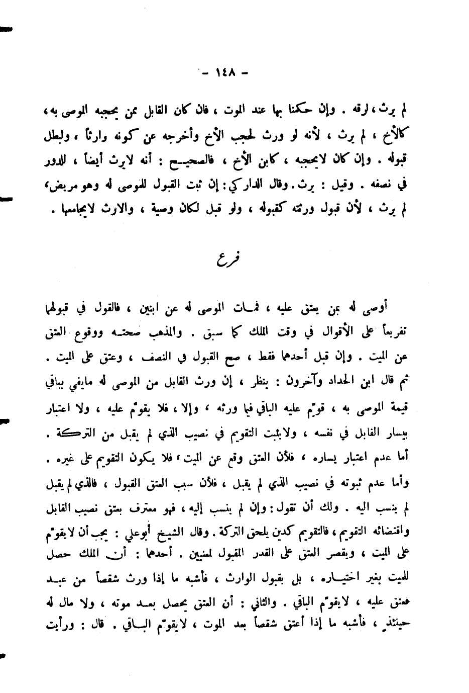 ثُمَّ قَالَ ابْنُ الْحَدَّادِ وَآخَرُونَ: يُنْظَرُ، إِنْ وَرِثَ الْقَابِلُ مِنَ الْمُوصَى لَهُ مَا يَفِي بِبَاقِي قِيمَةِ الْمُوصَى بِهِ، قُوِّمَ عَلَيْهِ الْبَاقِي فِيمَا وَرِثَهُ، وَإِلَّا فَلَا يُقَوَّمُ عَلَيْهِ، وَلَا اعْتِبَارَ بِيَسَارِ الْقَابِلِ فِي نَفْسٍ، وَلَا يَثْبُتُ التَّقْوِيمُ فِي نَصِيبِ الَّذِي لَمْ يَقْبَلْ مِنَ التَّرِكَةِ.