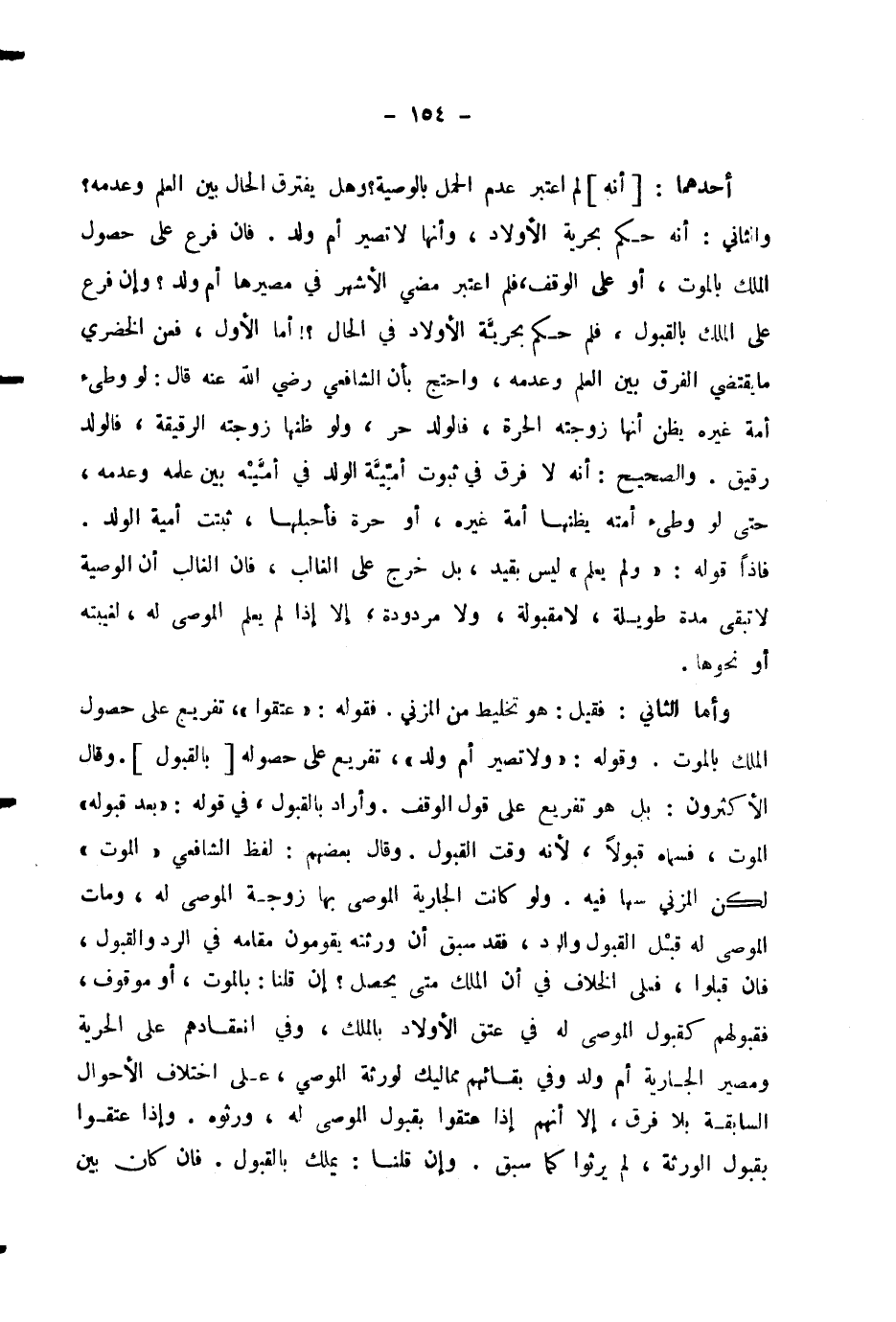 أَحَدُهُمَا: «أَنَّهُ» لِمَ اعْتَبَرَ عَدَمَ الْحَمْلِ بِالْوَصِيَّةِ؟ وَهَلْ يَفْتَرِقُ الْحَالُ بَيْنَ الْعِلْمِ وَعَدَمِهِ؟ وَالثَّانِي: أَنَّهُ حَكَمَ بِحُرِّيَّةِ الْأَوْلَادِ، وَأَنَّهَا لَا تَصِيرُ أُمَّ وَلَدٍ.