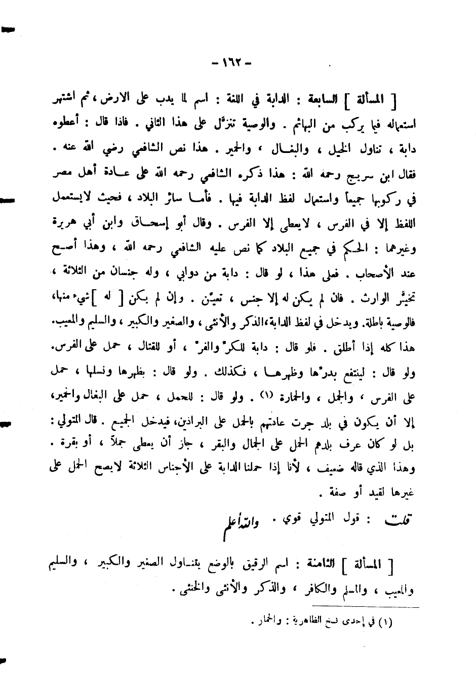 (الْمَسْأَلَةُ) السَّابِعَةُ: الدَّابَّةُ فِي اللُّغَةِ: اسْمٌ لِمَا يَدِبُّ عَلَى الْأَرْضِ، ثُمَّ اشْتُهِرَ اسْتِعْمَالُهُ فِيمَا يُرْكَبُ مِنَ الْبَهَائِمِ.