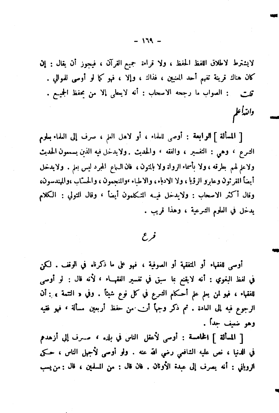 (الْمَسْأَلَةُ) الرَّابِعَةُ: أَوْصَى لِلْعُلَمَاءِ، أَوْ لِأَهْلِ الْعِلْمِ، صُرِفَ إِلَى الْعُلَمَاءِ بِعُلُومِ الشَّرْعِ، وَهِيَ: التَّفْسِيرُ، وَالْفِقْهُ، وَالْحَدِيثُ.