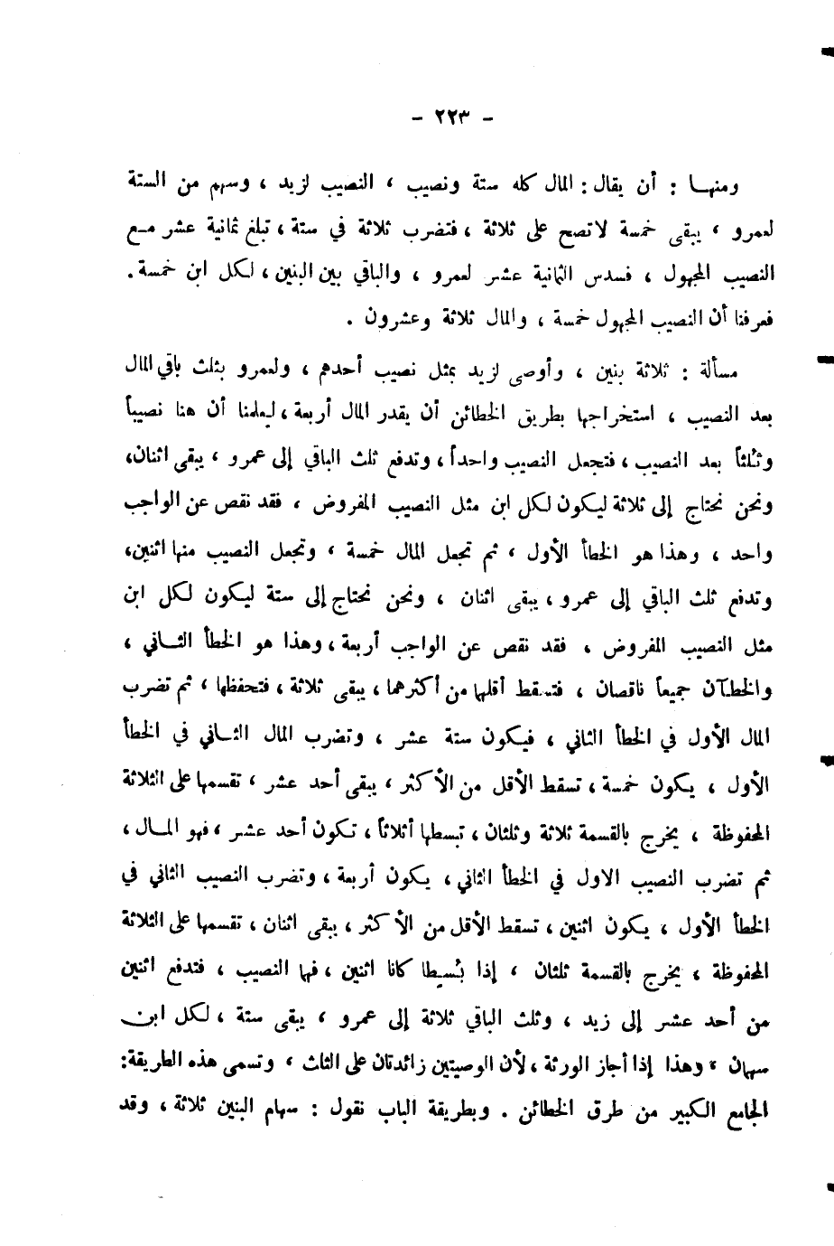 مَسْأَلَةٌ: ثَلَاثَةُ بَنِينَ، وَأَوْصَى لِزَيْدٍ بِمِثْلِ نَصِيبِ أَحَدِهِمْ، وَلِعَمْرٍو بِثُلُثِ بَاقِي الْمَالِ بَعْدَ النَّصِيبِ، اسْتِخْرَاجُهَا بِطْرِيقِ الْخَطَائِنِ أَنْ يُقَدَّرَ الْمَالُ أَرْبَعَةً، لِيُعْلِمَنَا أَنَّ هُنَا نَصِيبًا وَثُلُثًا بَعْدَ النَّصِيبِ، فَتَجْعَلَ النَّصِيبَ وَاحِدًا، وَتَدْفَعَ ثُلُثَ الْبَاقِي إِلَى عَمْرٍو، يَبْقَى اثْنَانِ، وَنَحْنُ نَحْتَاجُ إِلَى ثَلَاثَةٍ لِيَكُونَ لِكُلِّ ابْنٍ مِثْلُ النَّصِيبِ الْمَفْرُوضِ، فَقَدْ نَقَصَ عَنِ الْوَاجِبِ وَاحِدٌ، وَهَذَا هُوَ الْخَطَأُ الْأَوَّلُ.