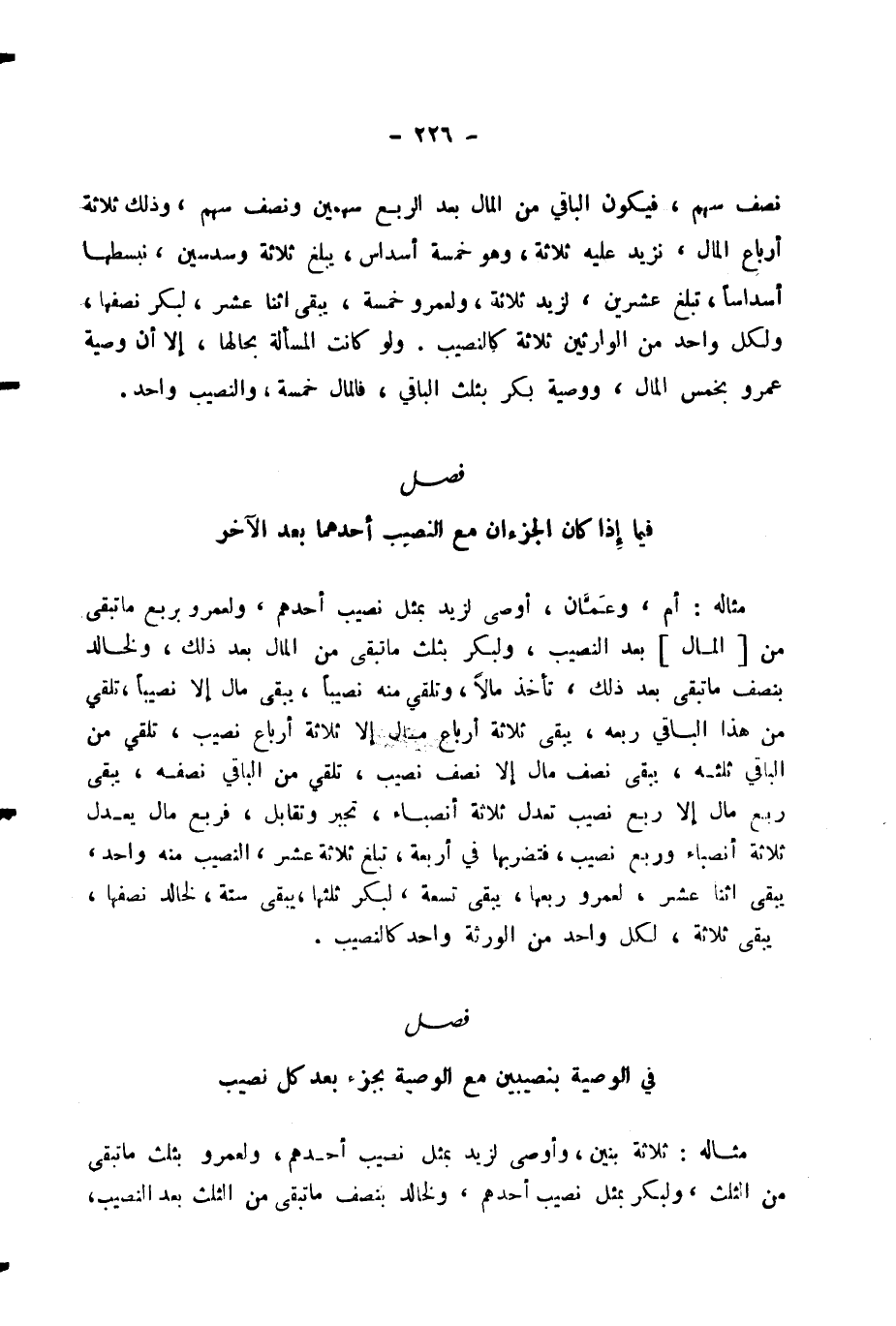 فِيمَا إِذَا كَانَ الْجُزْءَانِ مَعَ النَّصِيبِ أَحَدُهُمَا بَعْدَ الْآخَرِ مِثَالُهُ: أُمٌّ، وَعَمَّانِ، أَوْصَى لِزَيْدٍ بِمِثْلِ نَصِيبِ أَحَدِهِمْ، وَلِعَمْرٍو بِرُبُعِ مَا تَبَقَّى مِنْ [الْمَالِ] بَعْدَ النَّصِيبِ، وَلِبَكْرٍ بِثُلُثِ مَا تَبَقَّى مِنَ الْمَالِ بَعْدَ ذَلِكَ، وَلِخَالِدٍ بِنِصْفِ مَا تَبَقَّى بَعْدَ ذَلِكَ.