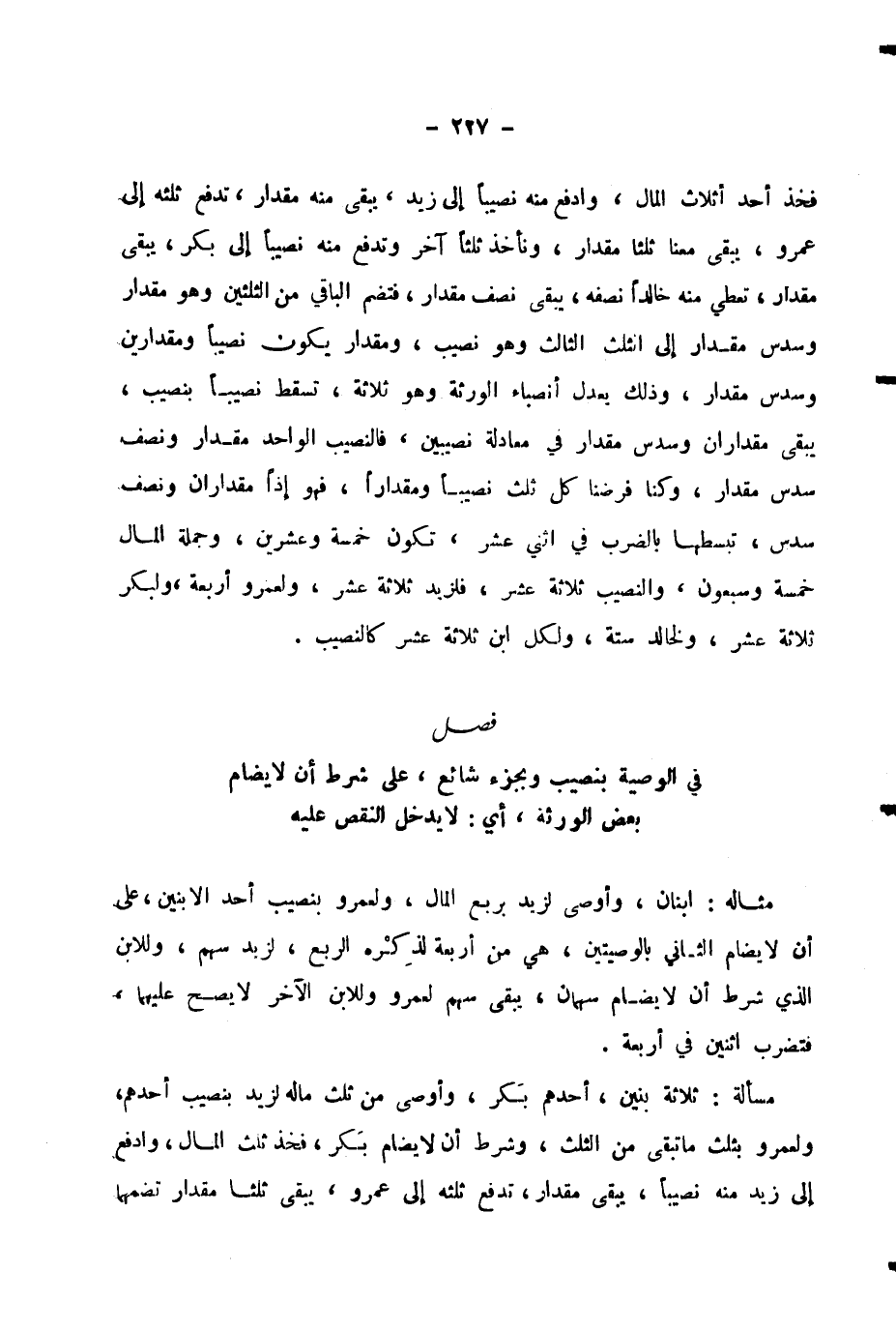 فَخُذْ أَحَدَ أَثْلَاثِ الْمَالِ، وَادْفَعْ مِنْهُ نَصِيبًا إِلَى زَيْدٍ، يَبْقَى مِنْهُ مِقْدَارٌ، تَدْفَعُ ثُلُثَهُ إِلَى عَمْرٍو، يَبْقَى مَعَنَا ثُلُثَا مِقْدَارٍ، وَنَأْخُذُ ثُلُثًا آخَرَ وَتَدْفَعُ مِنْهُ نَصِيبًا إِلَى بَكْرٍ، يَبْقَى مِقْدَارٌ، تُعْطِي مِنْهُ خَالِدًا نِصْفَهُ، يَبْقَى نِصْفُ مِقْدَارٍ، فَتَضُمُّ الْبَاقِيَ مِنَ الثُّلُثَيْنِ وَهُوَ مِقْدَارٌ وَسُدُسُ مِقْدَارٍ إِلَى الثُّلُثِ الثَّالِثِ وَهُوَ نَصِيبٌ، وَمِقْدَارٌ يَكُونُ نَصِيبًا وَمِقْدَارَيْنِ وَسُدُسَ مِقْدَارٍ، وَذَلِكَ يَعْدِلُ أَنْصِبَاءَ الْوَرَثَةِ وَهُوَ ثَلَاثَةٌ، تُسْقِطُ نَصِيبًا بِنَصِيبٍ، يَبْقَى مِقْدَارَانِ وَسُدُسُ مِقْدَارٍ فِي مُعَادَلَةِ نَصِيبَيْنِ، فَالنَّصِيبُ الْوَاحِدُ مِقْدَارٌ وَنِصْفُ سُدُسِ مِقْدَارٍ، وَكُنَّا فَرَضْنَا كُلَّ ثُلُثٍ نَصِيبًا وَمِقْدَارًا، فَهُوَ إِذًا مِقْدَارَانِ وَنِصْفُ سُدُسٍ، تَبْسُطُهَا بِالضَّرْبِ فِي اثْنَيْ عَشَرَ، تَكُونُ خَمْسَةً وَعِشْرِينَ، وَجُمْلَةُ الْمَالِ خَمْسَةٌ وَسَبْعُونَ، وَالنَّصِيبُ ثَلَاثَةَ عَشَرَ، فَلِزَيْدٍ ثَلَاثَةَ عَشَرَ، وَلِعَمْرٍو أَرْبَعَةٌ، وَلِبَكْرٍ ثَلَاثَةَ عَشَرَ، وَلِخَالِدٍ سِتَّةٌ، وَلِكُلِّ ابْنٍ ثَلَاثَةَ عَشَرَ كَالنَّصِيبِ.