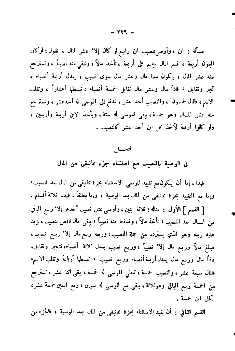 (الْقِسْمُ) الْأَوَّلُ: مِثَالُهُ: ثَلَاثَةُ بَنِينَ، وَأَوْصَى بِمِثْلِ نَصِيبِ أَحَدِهِمْ إِلَّا رُبُعَ الْبَاقِي مِنَ الْمَالِ بَعْدَ النَّصِيبِ، تَأْخُذُ مَالًا وَتُسْقِطُ مِنْهُ نَصِيبًا، يَبْقَى مَالٌ نَاقِصٌ بِنَصِيبٍ، تَزِيدُ عَلَيْهِ رُبُعَهُ وَهُوَ الَّذِي يَسْتَرِدُّهُ مِنْ جُمْلَةِ النَّصِيبِ، وَرُبُعُهُ رُبُعُ مَالٍ إِلَّا رُبُعَ نَصِيبٍ، فَيَبْلُغُ مَالًا وَرُبُعَ مَالٍ إِلَّا نَصِيبًا، وَرُبُعُ نَصِيبٍ يَعْدِلُ ثَلَاثَةَ أَنْصِبَاءَ، فَتَجْبُرُ وَتُقَابِلُ، فَإِذَا مَالٌ وَرُبُعُ مَالٍ يَعْدِلُ أَرْبَعَةَ أَنْصِبَاءَ وَرُبُعَ نَصِيبٍ، تَبْسُطُهَا أَرْبَاعًا وَتقْلِبُ الِاسْمَ، فَالْمَالُ سَبْعَةَ عَشَرَ، وَالنَّصِيبُ خَمْسَةٌ، تُعْطِي الْمُوصَى لَهُ خَمْسَةً، يَبْقَى اثْنَا عَشَرَ، تَسْتَرْجِعُ مِنَ الْخَمْسَةِ رُبُعَ الْبَاقِي وَهُوَ ثَلَاثَةٌ، يَبْقَى مَعَ الْمُوصَى لَهُ سَهْمَانِ، وَمَعَ الْبَنِينَ خَمْسَةَ عَشَرَ، لِكُلِّ ابْنٍ خَمْسَةٌ.
