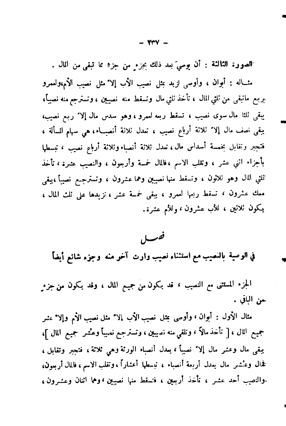مِثَالُهُ: أَبَوَانِ، وَأَوْصَى لِزَيْدٍ بِمِثْلِ نَصِيبِ الْأَبِ إِلَّا مِثْلَ نَصِيبِ الْأُمِّ، وَلِعَمْرٍو بِرُبُعِ مَا تَبَقَّى مِنْ ثُلُثَيِ الْمَالِ، تَأْخُذُ ثُلُثَيْ مَالٍ وَتُسْقِطُ مِنْهُ نَصِيبَيْنِ، وَتَسْتَرْجِعُ مِنْهُ نَصِيبًا، يَبْقَى ثُلُثَا مَالٍ سِوَى نَصِيبٍ، تُسْقِطُ رُبُعَهُ لِعَمْرٍو، وَهُوَ سُدُسُ مَالٍ إِلَّا رُبُعَ نَصِيبٍ، يَبْقَى نِصْفُ مَالٍ إِلَّا ثَلَاثَةَ أَرْبَاعِ نَصِيبٍ، تَعْدِلُ ثَلَاثَةَ أَنْصِبَاءَ، هِيَ سِهَامُ الْمَسْأَلَةِ، فَتَجْبُرُ وَتُقَابِلُ بِخَمْسَةِ أَسْدَاسِ مَالٍ، تَعْدِلُ ثَلَاثَةَ أَنْصِبَاءَ وَثَلَاثَةَ أَرْبَاعِ نَصِيبٍ، تَبْسُطُهَا بِأَجْزَاءِ اثْنَيْ عَشَرَ، وَتَقْلِبُ الِاسْمَ، فَالْمَالُ خَمْسَةٌ وَأَرْبَعُونَ، وَالنَّصِيبُ عَشَرَةٌ، تَأْخُذُ ثُلُثَيِ الْمَالِ وَهُوَ ثَلَاثُونَ، وَتُسْقِطُ مِنْهَا نَصِيبَيْنِ وَهُمَا عِشْرُونَ، وَتَسْتَرْجِعُ نَصِيبًا، يَبْقَى مَعَكَ عِشْرُونَ، تُسْقِطُ رُبُعَهَا لِعَمْرٍو، يَبْقَى خَمْسَةَ عَشَرَ، تَزِيدُهَا عَلَى ثُلُثِ الْمَالِ، يَكُونُ ثَلَاثِينَ، لِلْأَبِ عِشْرُونَ، وَلِلْأُمِّ عَشَرَةٌ.