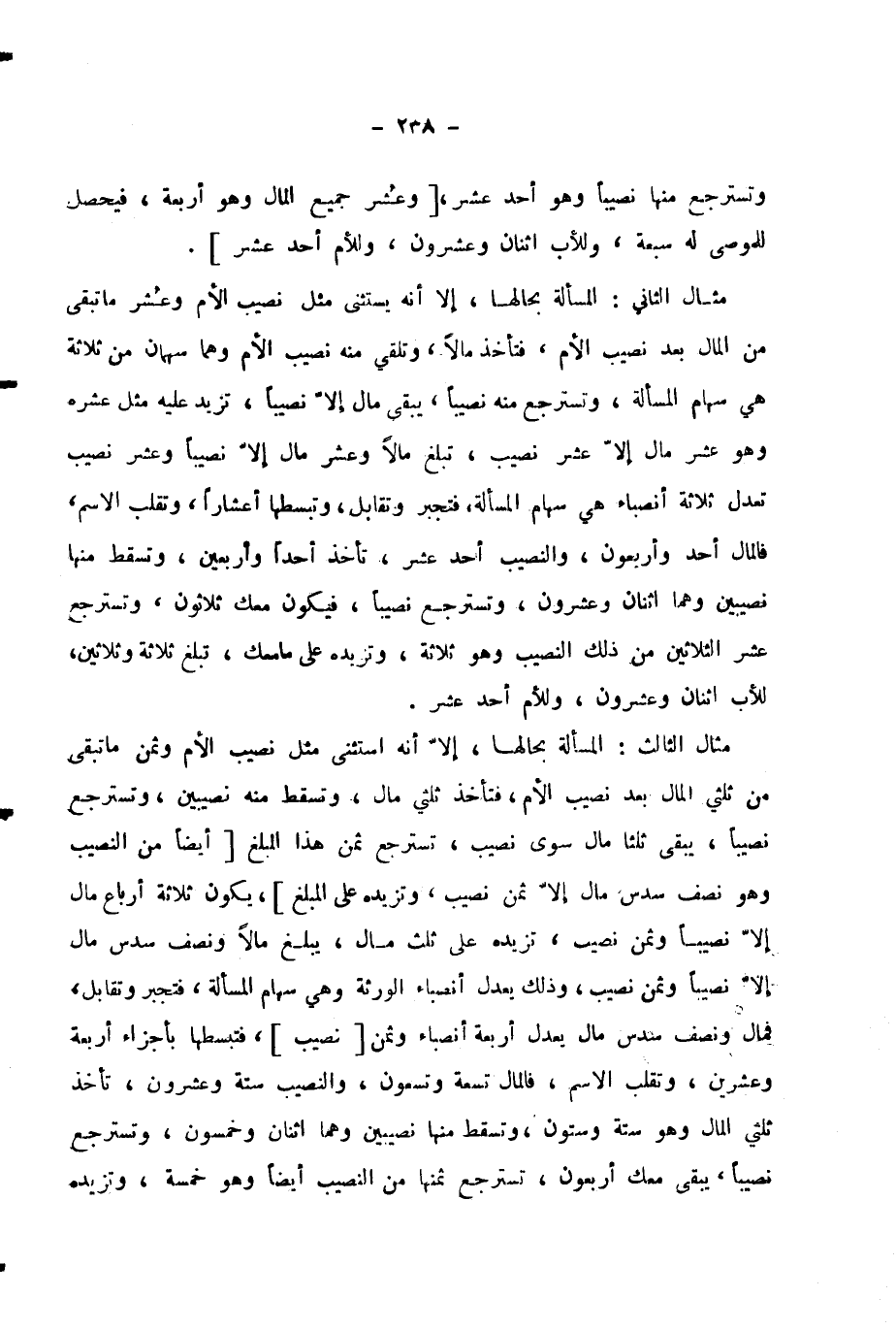 مِثَالُ الثَّالِثِ: الْمَسْأَلَةُ بِحَالِهَا، إِلَّا أَنَّهُ اسْتَثْنَى مِثْلَ نَصِيبِ الْأُمِّ وَثُمُنَ مَا تَبَقَّى مِنْ ثُلُثَيِ الْمَالِ بَعْدَ نَصِيبِ الْأُمِّ، فَتَأْخُذُ ثُلُثَيْ مَالٍ، وَتُسْقِطُ مِنْهُ نَصِيبَيْنِ، وَتَسْتَرْجِعُ نَصِيبًا، يَبْقَى ثُلُثَا مَالٍ سِوَى نَصِيبٍ، تَسْتَرْجِعُ ثُمُنَ هَذَا الْمَبْلَغِ [أَيْضًا مِنَ النَّصِيبِ وَهُوَ نِصْفُ سُدُسِ مَالٍ إِلَّا ثُمُنَ نِصْفٍ، وَتَزِيدُهُ عَلَى الْمَبلَغِ] ، يَكُونُ ثَلَاثَةَ أَرْبَاعِ مَالٍ إِلَّا نَصِيبًا وَثُمُنَ نَصِيبٍ، تَزِيدُهُ عَلَى ثُلُثِ مَالٍ، يَبْلُغُ مَالًا وَنِصْفَ سُدُسِ مَالٍ إِلَّا نَصِيبًا وَثُمُنَ نَصِيبٍ، وَذَلِكَ يَعْدِلُ أَنْصِبَاءَ الْوَرَثَةِ وَهِيَ سِهَامُ الْمَسْأَلَةِ.