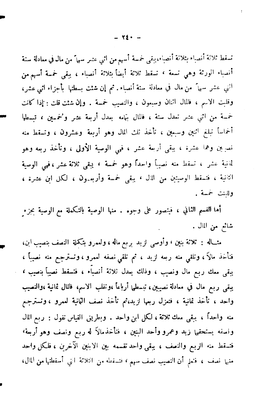 مِثَالُهُ: ثَلَاثَةُ بَنِينَ، وَأَوْصَى لِزَيْدٍ بِرُبُعِ مَالِهِ، وَلِعَمْرٍو بِتَكْمِلَةِ النِّصْفِ بِنَصِيبِ ابْنٍ، فَتَأْخُذُ مَالًا، وَتُلْقِي مِنْهُ رُبُعَهُ لِزَيْدٍ، ثُمَّ تُلْقِي نِصْفَهُ لِعَمْرٍو، وَتَسْتَرْجِعُ مِنْهُ نَصِيبًا، يَبْقَى مَعَكَ رُبُعُ مَالٍ وَنَصِيبٌ، وَذَلِكَ يَعْدِلُ ثَلَاثَةَ أَنْصِبَاءَ، فَتُسْقِطُ نَصِيبًا بِنَصِيبٍ، يَبْقَى رُبُعُ مَالٍ فِي مُعَادَلَةِ نَصِيبَيْنِ، تَبْسُطُهُمَا أَرْبَاعًا، وَتَقْلِبُ الِاسْمَ، فَالْمَالُ ثَمَانِيَةٌ، وَالنَّصِيبُ وَاحِدٌ، تَأْخُذُ ثَمَانِيَةً، فَتَعْزِلُ رُبُعَهَا لِزَيْدٍ، ثُمَّ تَأْخُذُ نِصْفَ الثَّمَانِيَةِ لِعَمْرٍو، وَتَسْتَرْجِعُ مِنْهُ وَاحِدًا، يَبْقَى مَعَكَ ثَلَاثَةٌ، لِكُلِّ ابْنٍ وَاحِدٌ.