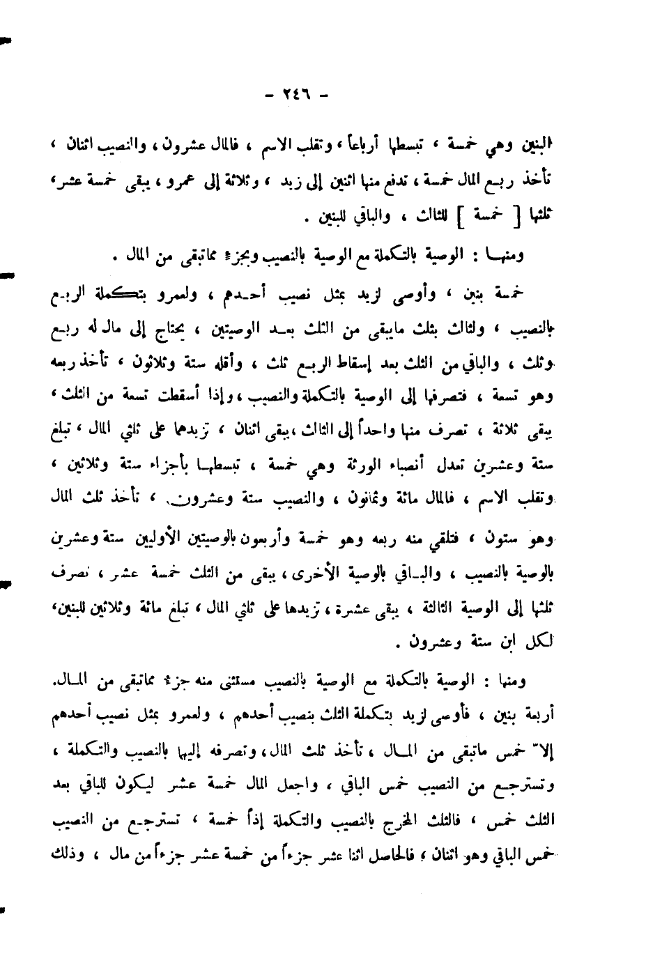خَمْسَةُ بَنِينَ، وَأَوْصَى لِزَيْدٍ بِمِثْلِ نَصِيبِ أَحَدِهِمْ، وَلِعَمْرٍو بِتَكْمِلَة الرُّبُعِ بِالنَّصِيبِ، وَلِثَالِثٍ بِثُلُثِ مَا يَبْقَى مِنَ الثُّلُثِ بَعْدِ الْوَصِيَّتَيْنِ، يَحْتَاجُ إِلَى مَالٍ لَهُ رُبُعٌ وَثُلُثٌ، وَالْبَاقِي مِنَ الثُّلُثِ بَعْدِ إِسْقَاطِ الرُّبُع ثُلُثٌ، وَأَقَلُّهُ سِتَّةٌ وَثَلَاثُونَ، تَأْخُذُ رُبُعَهُ وَهُوَ تِسْعَةٌ، فَتَصْرِفُهَا إِلَى الْوَصِيَّةِ بِالتَّكْمِلَةِ وَالنَّصِيبِ، وَإِذَا أَسْقَطْتَ تِسْعَةً مِنَ الثُّلُثِ، يَبْقَى ثَلَاثَةٌ، تَصْرِفُ مِنْهَا وَاحِدًا إِلَى الثَّالِثِ، يَبْقَى اثْنَانِ، تَزِيدُهُمَا عَلَى ثُلُثَيِ الْمَالِ، تَبْلُغُ سِتَّةً وَعِشْرِينَ تَعْدِلُ أَنْصِبَاءَ الْوَرَثَةِ وَهِيَ خَمْسَةٌ، تَبْسُطُهَا بِأَجْزَاءِ سِتَّةٍ وَثَلَاثِينَ، وَتَقْلِبُ الِاسْمَ، فَالْمَالُ مِائَةٌ وَثَمَانُونَ، وَالنَّصِيبُ سِتَّةٌ وَعِشْرُونَ، تَأْخُذُ ثُلُثَ الْمَالِ وَهُوَ سِتُّونَ، فَتُلْقِي مِنْهُ رُبُعَهُ وَهُوَ خَمْسَةٌ وَأَرْبَعُونَ بِالْوَصِيَّتَيْنِ الْأُولَيَيْنِ، سِتَّةً وَعِشْرِينَ بِالْوَصِيَّةِ بِالنَّصِيبِ، وَالْبَاقِيَ بِالْوَصِيَّةِ الْأُخْرَى، يَبْقَى مِنَ الثُّلُثِ خَمْسَةَ عَشَرَ، نَصْرِفُ ثُلُثَهَا إِلَى الْوَصِيَّةِ الثَّالِثَةِ، يَبْقَى عَشَرَةٌ، تَزِيدُهَا عَلَى ثُلُثَيِ الْمَالِ، تَبْلُغُ مِائَةً وَثَلَاثِينَ لِلْبَنِينَ، لِكُلِّ ابْنٍ سِتَّةٌ وَعِشْرُونَ.