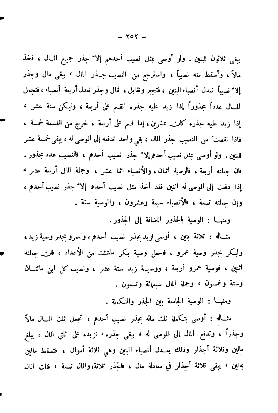 وَلَوْ أَوْصَى بِمِثْلِ نَصِيبِ أَحَدِهِمْ إِلَّا جِذْرَ جَمِيعِ الْمَالِ، فَخُذْ مَالًا، وَأَسْقِطْ مِنْهُ نَصِيبًا، وَاسْتَرْجِعْ مِنَ النَّصِيبِ جِذْرَ الْمَالِ، يَبْقَى مَالٌ وَجِذْرٌ إِلَّا نَصِيبًا تَعْدِلُ أَنْصِبَاءَ الْبَنِينَ، فَتَجْبُرُ وَتُقَابِلُ، فَمَالٌ وَجِذْرٌ تَعْدِلُ أَرْبَعَةَ أَنْصِبَاءَ، فَتَجْعَلُ الْمَالَ عَدَدًا مَجْذُورًا إِذَا زِيدَ عَلَيْهِ جِذْرُهُ انْقَسَمَ عَلَى أَرْبَعَةٍ، وَلْيَكُنْ سِتَّةَ عَشَرَ، إِذَا زِيدَ عَلَيْهِ جِذْرُهُ كَانَ عِشْرِينَ، إِذَا قُسِّمَ عَلَى أَرْبَعَةٍ، خَرَجَ مِنَ الْقِسْمَةِ خَمْسَةٌ، فَإِذَا نَقَصْتَ مِنَ النَّصِيبِ جِذْرُ الْمَالِ، بَقِيَ وَاحِدٌ تَدْفَعُهُ إِلَى الْمُوصَى لَهُ، يَبْقَى خَمْسَةَ عَشَرَ لِلْبَنِينَ.