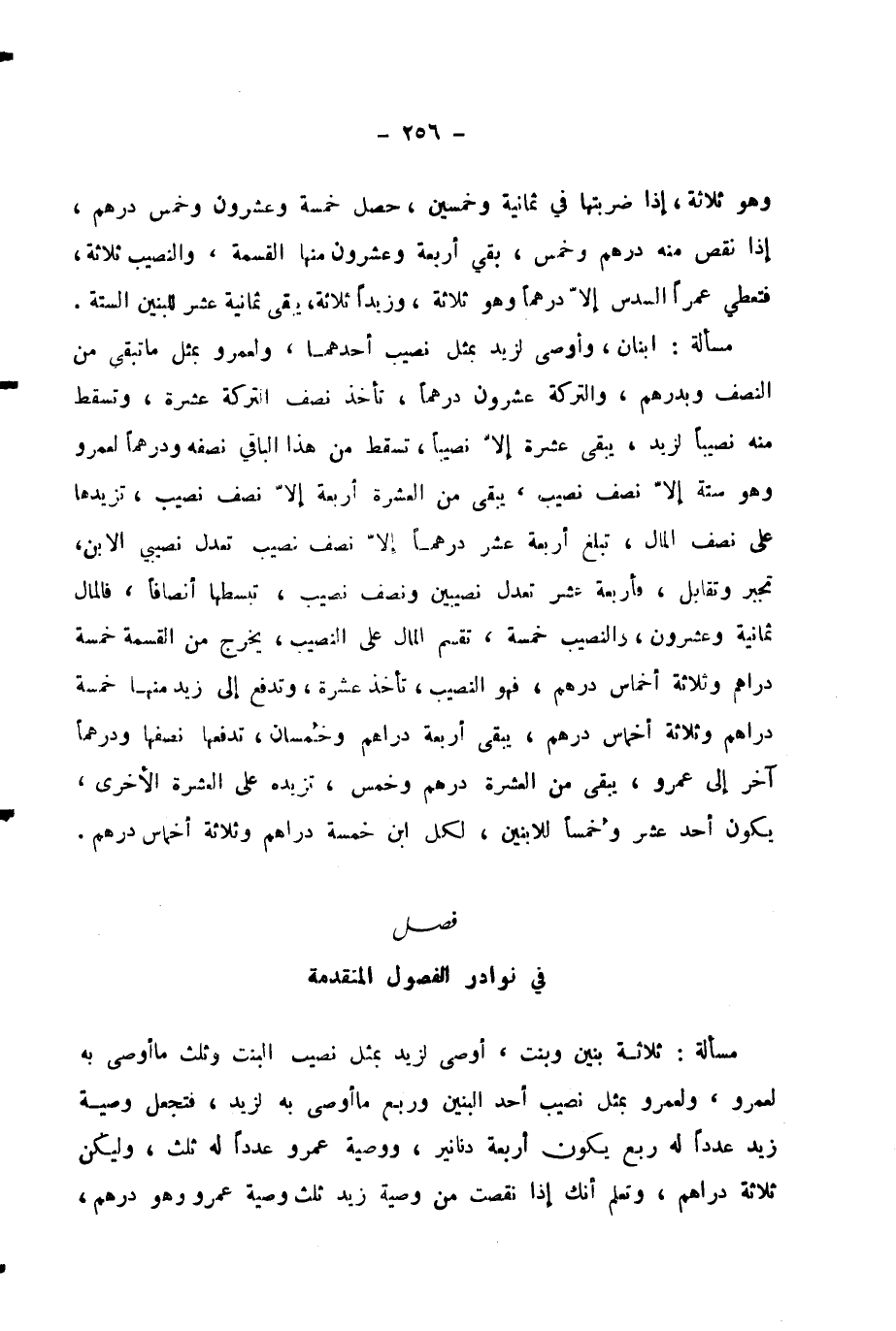 مَسْأَلَةٌ: ابْنَانِ، وَأَوْصَى لِزَيْدٍ بِمِثْلِ نَصِيبِ أَحَدِهِمَا، وَلِعَمْرٍو بِمِثْلِ مَا تَبَقَّى مِنَ النِّصْفِ وَبِدِرْهَمٍ، وَالتَّرِكَةُ عِشْرُونَ دِرْهَمًا، تَأْخُذُ نِصْفَ التَّرِكَةِ عَشَرَةً، وَتُسْقِطُ مِنْهُ نَصِيبًا، تُسْقِطُ مِنْ هَذَا الْبَاقِي نِصْفَهُ وَدِرْهَمًا لِعَمْرٍو وَهُوَ سِتَّةٌ إِلَّا نِصْفَ نَصِيبٍ، يَبْقَى مِنَ الْعَشَرَةِ أَرْبَعَةٌ إِلَّا نِصْفَ نَصِيبٍ، تَزِيدُهَا عَلَى نِصْفِ الْمَالِ، تَبْلُغُ أَرْبَعَةَ عَشَرَ دِرْهَمًا إِلَّا نِصْفَ نَصِيبٍ تَعْدِلُ نَصِيبَيِ الِابْنِ، تَجْبُرُ وَتُقَابِلُ، فَأَرْبَعَةَ عَشَرَ تَعْدِلُ نَصِيبَيْنِ وَنِصْفَ نَصِيبٍ، تَبْسُطُهَا أَنْصَافًا، فَالْمَالُ ثَمَانِيَةٌ وَعِشْرُونَ، وَالنَّصِيبُ خَمْسَةٌ، تُقَسِّمُ الْمَالَ عَلَى النَّصِيبِ، يَخْرُجُ مِنَ الْقِسْمَةِ خَمْسَةُ دَرَاهِمَ وَثَلَاثَةُ أَخْمَاسِ دِرْهَمٍ، فَهُوَ النَّصِيبُ، تَأْخُذُ عَشَرَةً، وَتَدْفَعُ إِلَى زَيْدٍ مِنْهَا خَمْسَةَ دَرَاهِمَ وَثَلَاثَةَ أَخْمَاسِ دِرْهَمٍ، يَبْقَى أَرْبَعَةُ دَرَاهِمَ وَخُمُسَانِ، تَدْفَعُهَا نِصْفَهَا وَدِرْهَمًا آخَرَ إِلَى عَمْرٍو، يَبْقَى مِنَ الْعَشَرَةِ دِرْهَمٌ وَخُمُسٌ، تَزِيدُهُ عَلَى الْعَشَرَةِ الْأُخْرَى، يَكُونُ أَحَدَ عَشَرَ وَخُمُسًا لِلِابْنَيْنِ، لِكُلِّ ابْنٍ خَمْسَةُ دَرَاهِمَ وَثَلَاثَةُ أَخْمَاسِ دِرْهَمٍ.