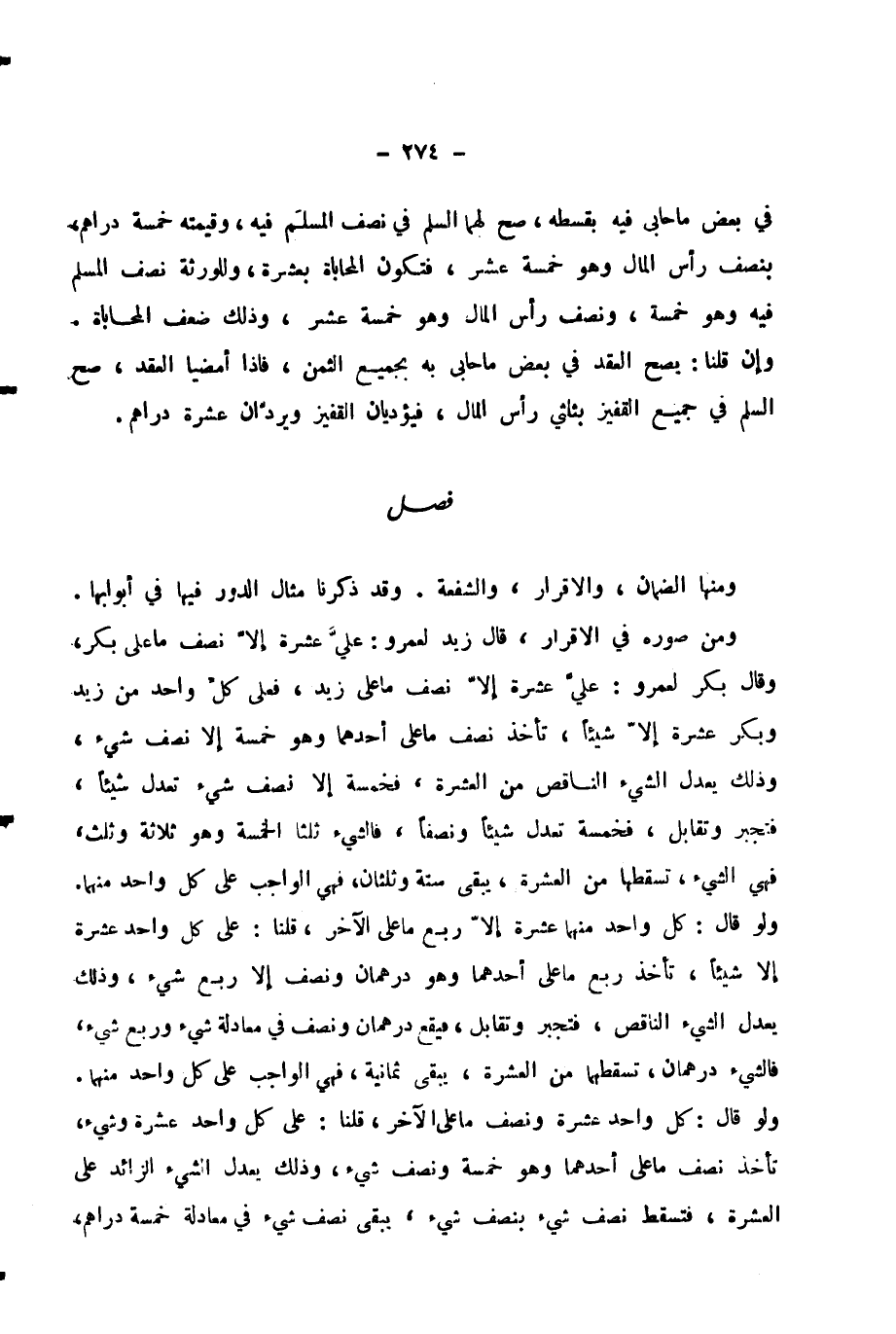 وَمِنْ صُوَرِهِ فِي الْإِقْرَارِ، قَالَ زَيْدٌ لِعَمْرٍو: عَلَيَّ عَشَرَةٌ إِلَّا نِصْفَ مَا عَلَى بَكْرٍ، وَقَالَ بَكْرٌ لِعَمْرٍو: عَلَيَّ عَشَرَةٌ إِلَّا نِصْفَ مَا عَلَى زَيْدٍ، فَعَلَى كُلِّ وَاحِدٍ مِنْ زَيْدٍ وَبَكْرٍ عَشَرَةٌ إِلَّا شَيْئًا، تَأْخُذُ نِصْفَ مَا عَلَى أَحَدِهِمَا وَهُوَ خَمْسَةٌ إِلَّا نِصْفَ شَيْءٍ، وَذَلِكَ يَعْدِلُ الشَّيْءَ النَّاقِصَ مِنَ الْعَشَرَةِ، فَخَمْسَةٌ إِلَّا نِصْفَ شَيْءٍ تَعْدِلُ شَيْئًا، فَتَجْبُرُ وَتُقَابِلُ، فَخَمْسَةٌ تَعْدِلُ شَيْئًا وَنِصْفًا، فَالشَّيْءُ ثُلُثَا الْخَمْسَةِ وَهُوَ ثَلَاثَةٌ وَثُلُثٌ، فَهِيَ الشَّيْءُ، تُسْقِطُهَا مِنَ الْعَشَرَةِ، يَبْقَى سِتَّةٌ وَثُلُثَانِ، فَهِيَ الْوَاجِبُ عَلَى كُلِّ وَاحِدٍ مِنْهُمَا.
