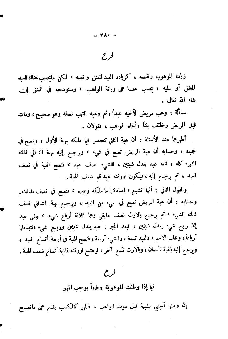 وَحِسَابُهُ: أَنَّ هِبَةَ الْمَرِيضِ تَصِحُّ فِي شَيْءٍ مِنَ الْعَبْدِ، وَيَرْجِعُ بِهِبَةِ الثَّانِي نِصْفَ ذَلِكَ الشَّيْءِ، ثُمَّ يَرْجِعُ بِالْإِرْثِ نِصْفَ مَا بَقِيَ وَهُمَا ثَلَاثَةُ أَرْبَاعِ شَيْءٍ، يَبْقَى عَبْدٌ إِلَّا رُبُعَ شَيْءٍ يَعْدِلُ شَيْئَيْنِ، فَبَعْدَ الْجَبْرِ: عَبْدٌ يَعْدِلُ شَيْئَيْنِ وَرُبُعَ شَيْءٍ، فَتَبْسُطُهَا أَرْبَاعًا، وَتَقْلِبُ الِاسْمَ، فَالْعَبْدُ تِسْعَةٌ، وَالشَّيْءُ أَرْبَعَةٌ، فَتَصِحُّ الْهِبَةُ فِي أَرْبَعَةِ أَتْسَاعِ الْعَبْدِ، وَيَرْجِعُ إِلَيْهِ بِالْهِبَةِ تُسُعَانِ، وَبِالْإِرْثِ تُسُعٌ آخَرَ، فَيَجْتَمِعُ لِوَرَثَتِهِ ثَمَانِيَةُ أَتْسَاعٍ ضِعْفُ الْهِبَةِ.