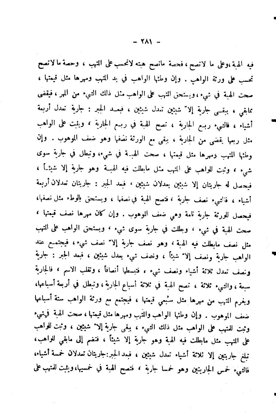 وَإِنْ كَانَ مَهْرُهَا نِصْفَ قِيمَتِهَا، صَحَّتِ الْهِبَةُ فِي شَيْءٍ، وَبَطَلَتْ فِي جَارِيَةٍ سِوَى شَيْءٍ، وَيَسْتَحِقُّ الْوَاهِبُ عَلَى الْمُتَّهِبِ مِثْلَ نِصْفِ مَا بَطَلَتْ فِيهِ الْهِبَةُ، وَهُوَ نِصْفُ جَارِيَةٍ إِلَّا نِصْفَ شَيْءٍ فَيَجْتَمِعُ عِنْدَ الْوَاهِبِ جَارِيَةٌ وَنِصْفٌ إِلَّا شَيْئًا، وَنِصْفُ شَيْءٍ يَعْدِلُ شَيْئَيْنِ، فَبَعْدَ الْجَبْرِ: جَارِيَةٌ وَنِصْفٌ تَعْدِلُ ثَلَاثَةَ أَشْيَاءَ وَنِصْفَ شَيْءٍ، فَتَبْسُطُهَا أَنْصَافًا، وَتَقْلِبُ الِاسْمَ، فَالْجَارِيَةُ سَبْعَةٌ، وَالشَّيْءُ ثَلَاثَةٌ، تَصِحُّ الْهِبَةُ فِي ثَلَاثَةِ أَسْبَاعِ الْجَارِيَةِ، وَتَبْطُلُ فِي أَرْبَعَةِ أَسِبَاعِهَا، وَيَغْرَمُ الْمُتَّهِبُ مِنْ مَهْرِهَا مِثْلَ سُبُعِ قِيمَتِهَا، فَيَجْتَمِعُ مَعَ وَرَثَةِ الْوَاهِبِ سِتَّةُ أَسْبَاعِهَا ضِعْفُ الْمَوْهُوبِ.