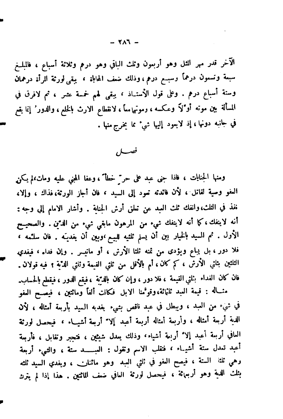 مِثَالُهُ: قِيمَةُ الْعَبْدِ ثَلَثُمِائَةٍ، وَقَوَّمْنَا الْإِبِلَ فَكَانَتْ أَلْفًا وَمِائَتَيْنِ، فَيَصِحُّ الْعَفْوُ فِي شَيْءٍ مِنَ الْعَبْدِ، وَيَبْطُلُ فِي عَبْدٍ نَاقِصٍ بِشَيْءٍ يَفْدِيهِ السَّيِّدُ بِأَرْبَعَةِ أَمْثَالِهِ ; لِأَنَّ الدِّيَةَ أَرْبَعَةُ أَمْثَالِهِ، وَأَرْبَعَةُ أَمْثَالِهِ أَرْبَعَةُ أَعْبُدٍ إِلَّا أَرْبَعَةَ أَشْيَاءَ، فَيَحْصُلُ لِوَرَثَةِ الْعَافِي أَرْبَعَةُ أَعْبُدٍ إِلَّا أَرْبَعَةَ أَشْيَاءَ، وَذَلِكَ يَعْدِلُ شَيْئَيْنِ، فَتَجْبُرُ وَتُقَابِلُ، فَأَرْبَعَةُ أَعْبُدٍ تَعْدِلُ سِتَّةَ أَشْيَاءَ، فَتَقْلِبُ الِاسْمَ، وَتَقُولُ: الْعَبْدُ سِتَّةٌ، وَالشَّيْءُ أَرْبَعَةٌ وَهِيَ ثُلُثَا السِّتَّةِ، فَيَصِحُّ الْعَفْوُ فِي ثُلُثَيِ الْعَبْدِ وَهُوَ مِائَتَانِ، وَيَفْدِي السَّيِّدُ ثُلُثَهُ بِثُلُثِ الدِّيَةِ وَهُوَ أَرْبَعُمِائَةٍ، فَيَحْصُلُ لِوَرَثَةِ الْعَافِي ضِعْفُ الْمِائَتَيْنِ.
