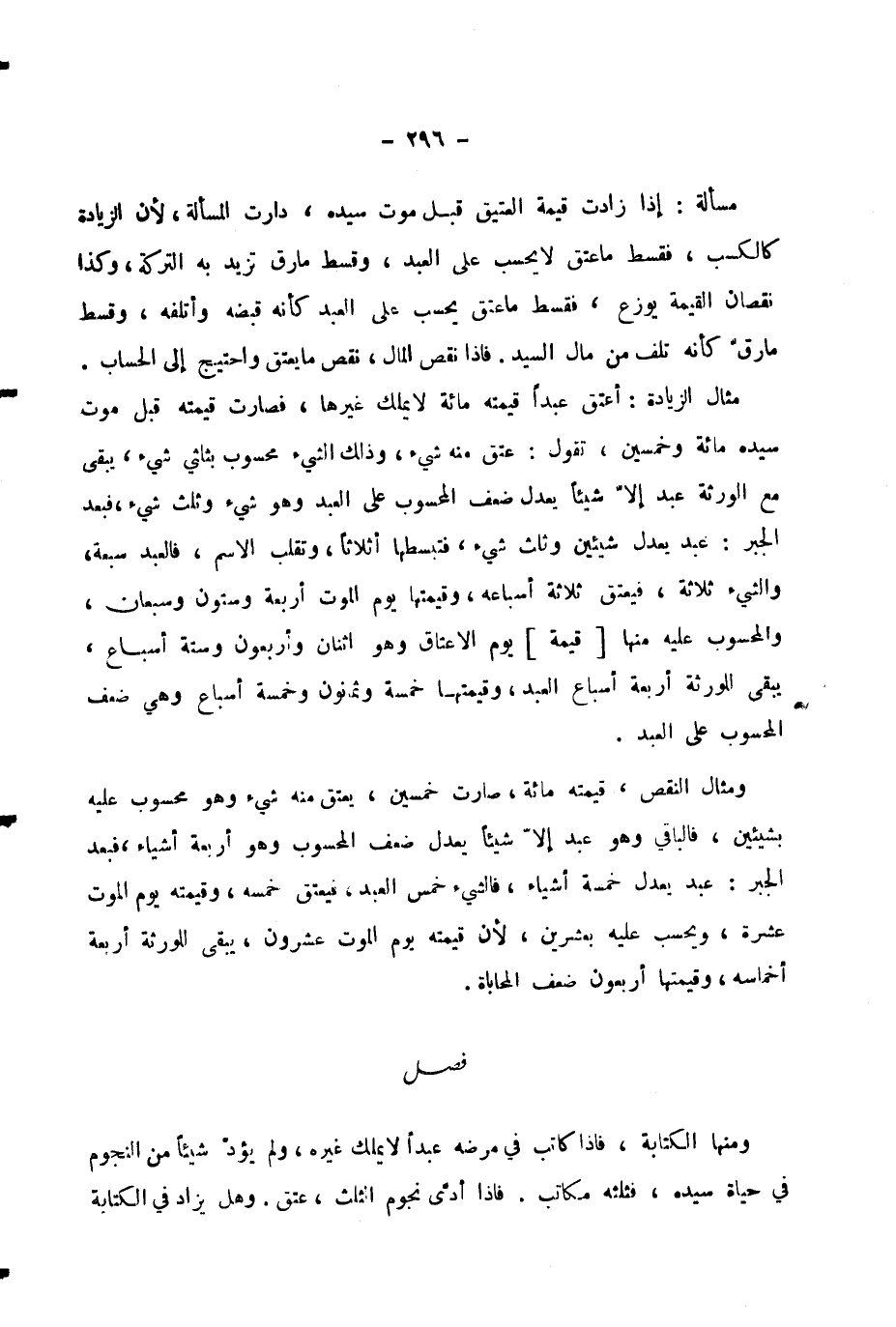 مِثَالُ الزِّيَادَةِ: أَعْتَقَ عَبْدًا قِيمَتُهُ مِائَةٌ لَا يَمْلِكُ غَيْرَهَا، فَصَارَتْ قِيمَتُهُ قَبْلَ مَوْتِ سَيِّدِهِ مِائَةً وَخَمْسِينَ، تَقُولُ: عَتَقَ مِنْهُ شَيْءٌ، وَذَلِكَ الشَّيْءُ مَحْسُوبٌ بِثُلْثَيْ شَيْءٍ، يَبْقَى مَعَ الْوَرَثَةِ عَبْدٌ إِلَّا شَيْئًا يَعْدِلُ ضِعْفَ الْمَحْسُوبِ عَلَى الْعَبْدِ وَهُوَ شَيْءٌ وَثُلُثُ شَيْءٍ، فَبَعْدَ الْجَبْرِ: عَبْدٌ يَعْدِلُ شَيْئَيْنِ وَثُلُثُ شَيْءٍ، فَتَبْسُطُهَا أَثْلَاثًا، وَتَقْلِبُ الِاسْمَ، فَالْعَبْدُ سَبْعَةٌ، وَالشَّيْءُ ثَلَاثَةٌ، فَيَعْتِقُ ثَلَاثَةُ أَسِبَاعِهِ، وَقِيمَتُهَا يَوْمَ الْمَوْتِ أَرْبَعَةٌ وَسِتُّونَ وَسَبْعَانِ، وَالْمَحْسُوبُ عَلَيْهِ مِنْهَا [قِيمَةُ] يَوْمِ الْإِعْتَاقِ وَهُوَ اثْنَانِ وَأَرْبَعُونَ وَسِتَّةُ أَسْبَاعٍ، يَبْقَى لِلْوَرَثَةِ أَرْبَعَةُ أَسْبَاعِ الْعَبْدِ، وَقِيمَتُهَا خَمْسَةٌ وَثَمَانُونَ وَخَمْسَةُ أَسْبَاعٍ وَهِيَ ضِعْفُ الْمَحْسُوبِ عَلَى الْعَبْدِ.