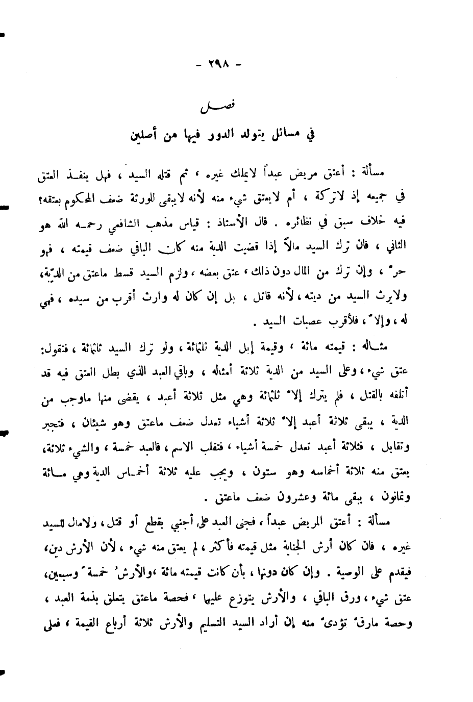 مِثَالُهُ: قِيمَتُهُ مِائَةٌ، وَقِيمَةُ إِبِلِ الدِّيَةِ ثَلَثُمِائَةٍ، وَلَوْ تَرَكَ السَّيِّدُ ثَلَثَمِائَةً، فَتَقُولُ: عَتَقَ شَيْءٌ، وَعَلَى السَّيِّدِ مِنَ الدِّيَةِ ثَلَاثَةُ أَمْثَالِهِ، وَبَاقِي الْعَبْدِ الَّذِي بَطَلَ الْعِتْقُ فِيهِ قَدْ أَتْلَفَهُ بِالْقَتْلِ، فَلَمْ يَتْرُكْ إِلَّا ثَلَاثَمِائَةٍ، وَهِيَ مِثْلُ ثَلَاثَةِ أَعْبُدٍ، يَقْضِي مِنْهَا مَا وَجَبَ مِنَ الدِّيَةِ، وَيَبْقَى ثَلَاثَةُ أَعْبُدٍ إِلَّا ثَلَاثَةَ أَشْيَاءَ تَعْدِلُ ضِعْفَ مَا عَتَقَ وَهُوَ شَيْئَانِ، فَتُجْبَرُ وَتُقَابَلُ، فَثَلَاثَةُ أَعْبُدٍ تَعْدِلُ خَمْسَةَ أَشْيَاءَ، فَتَقْلِبُ الِاسْمَ، فَالْعَبْدُ خَمْسَةٌ، وَالشَّيْءُ ثَلَاثَةٌ، يَعْتِقُ مِنْهُ ثَلَاثَةُ أَخْمَاسِهِ وَهُوَ سِتُّونَ، وَيَجِبُ عَلَيْهِ ثَلَاثَةُ أَخْمَاسِ الدِّيَةِ؛ وَهِيَ مِائَةٌ وَثَمَانُونَ، يَبْقَى مِائَةٌ وَعِشْرُونَ ضِعْفَ مَا عَتَقَ.