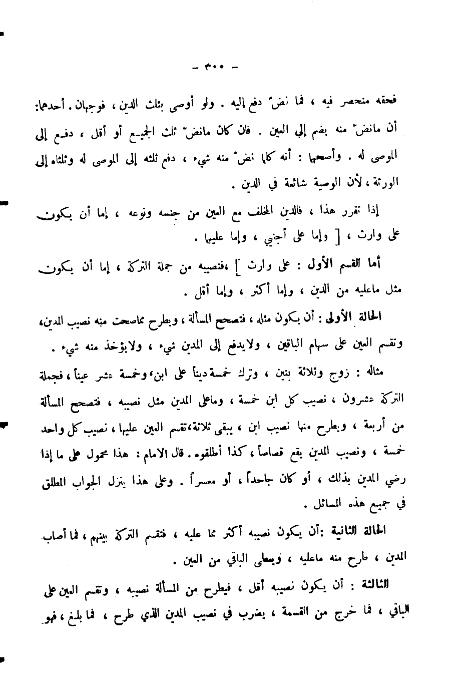 أَمَّا الْقِسْمُ الْأَوَّلُ: عَلَى وَارِثٍ] ، فَنَصِيبُهُ مِنْ جُمْلَةِ التَّرِكَةِ، إِمَّا أَنْ يَكُونَ مِثْلَ مَا عَلَيْهِ مِنَ الدَّيْنِ، وَإِمَّا أَكْثَرَ، وَإِمَّا أَقَلَّ.